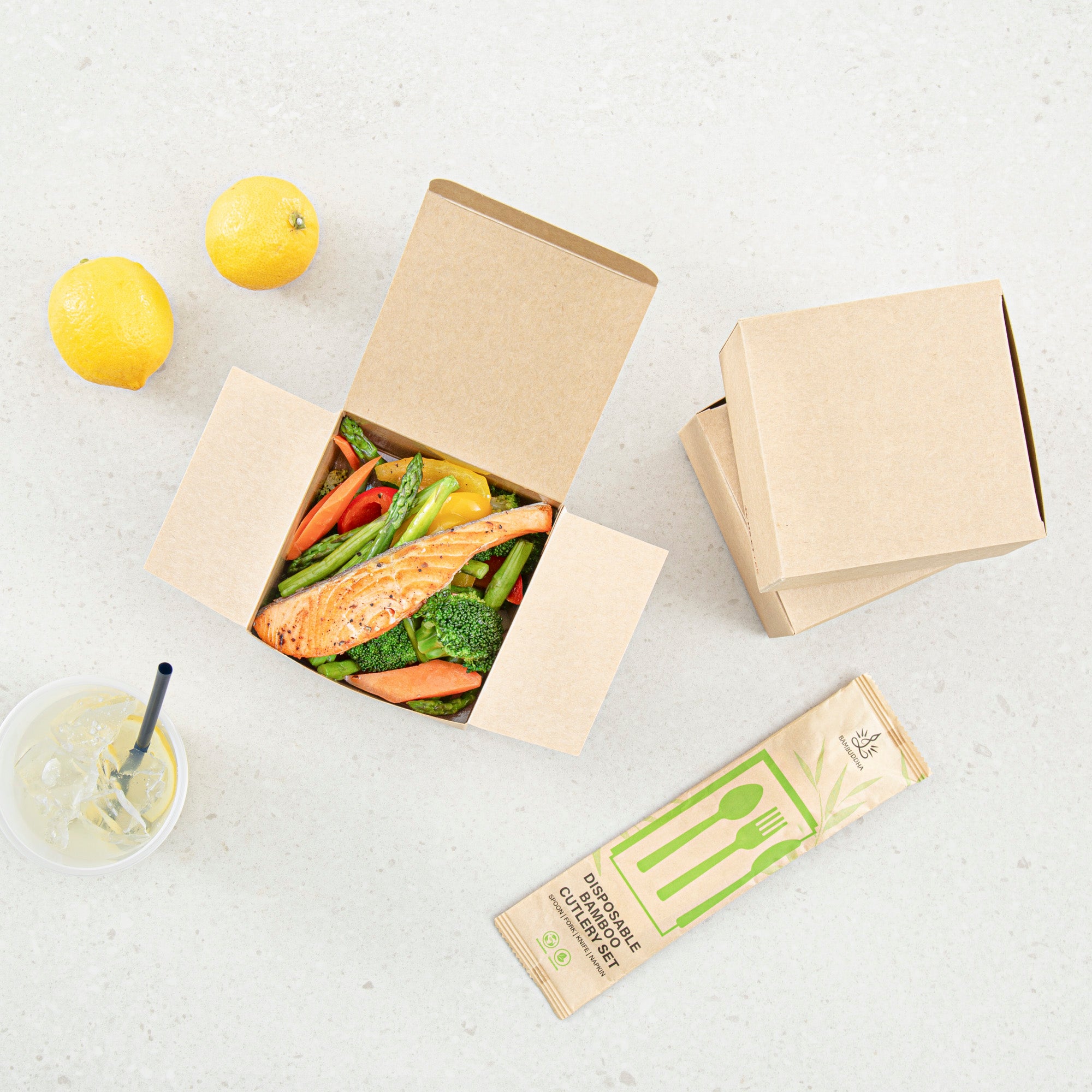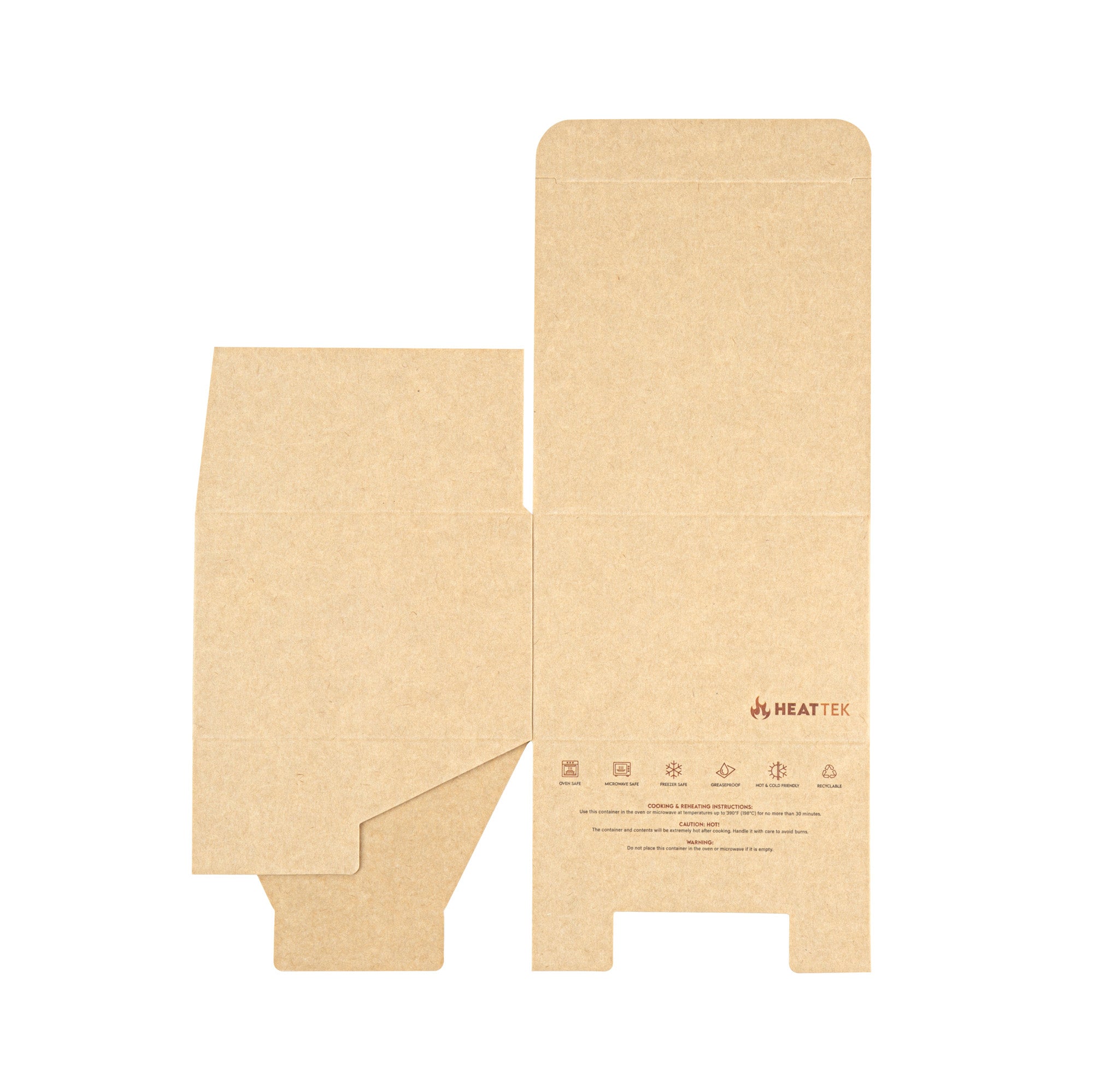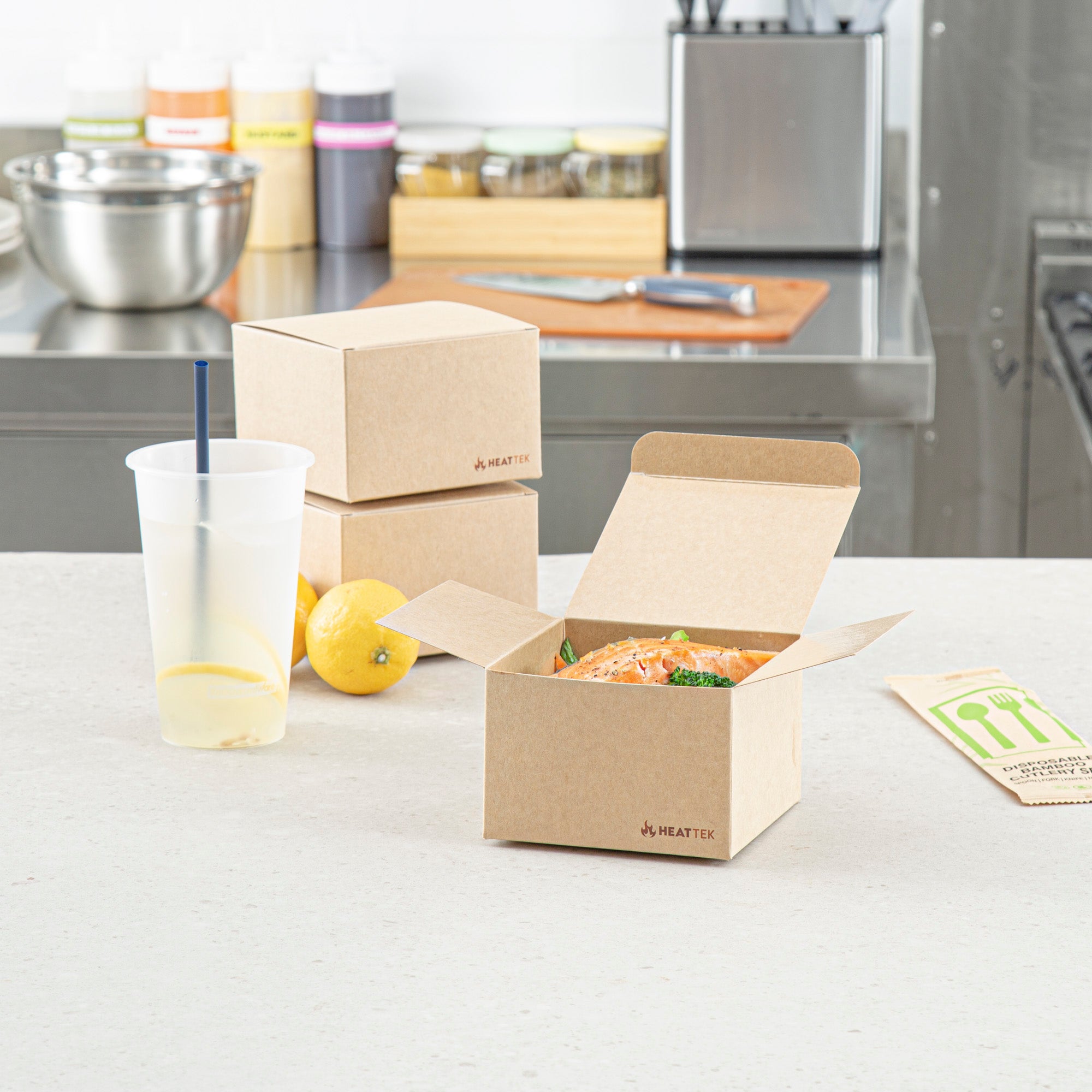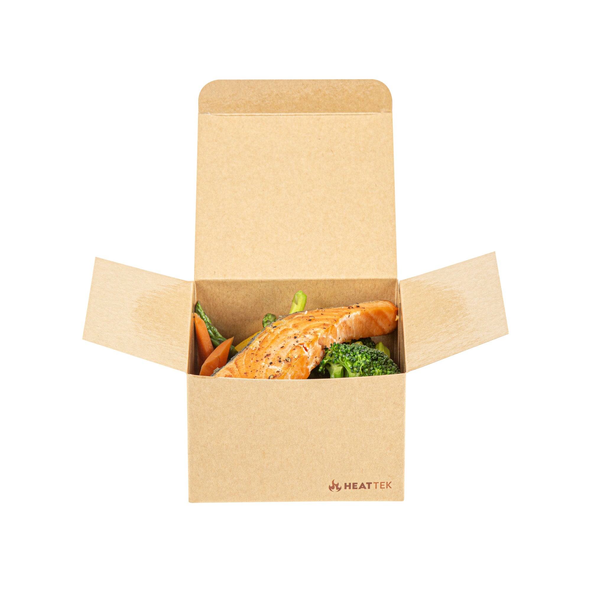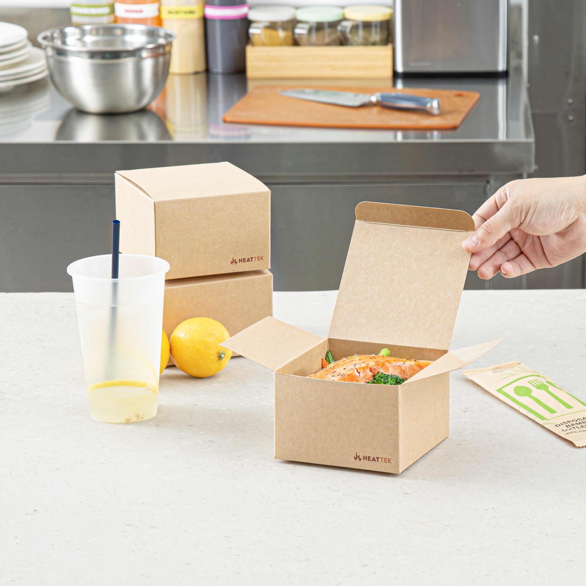 Deliver oven-fresh meals with ease using our Heat Tek Kraft Paper Take Out Containers. The tuck-top lid on these paper containers helps retain warmth and flavors, while allowing quick and secure closure. Made from durable paper, these oven-friendly food containers endure heat up to 260°F, making them ideal for reheating and serving. The grease-resistant lining inside these to-go boxes contains messes from oily or saucy dishes. These disposable take out boxes offer a simple, efficient solution for fast cleanup after service. Perfect for holding pastas, entrees, and side dishes, these kraft take out boxes handle both hot and chilled foods. Freezable for storage, these food containers preserve food quality before serving. Made with sustainability in mind, these eco-conscious boxes can be recycled after use. Measuring 4.5 inches in length by 4.5 inches in width by 2.85 inches in height, these kraft containers are sized for generous servings. Sold in a 100 count box.