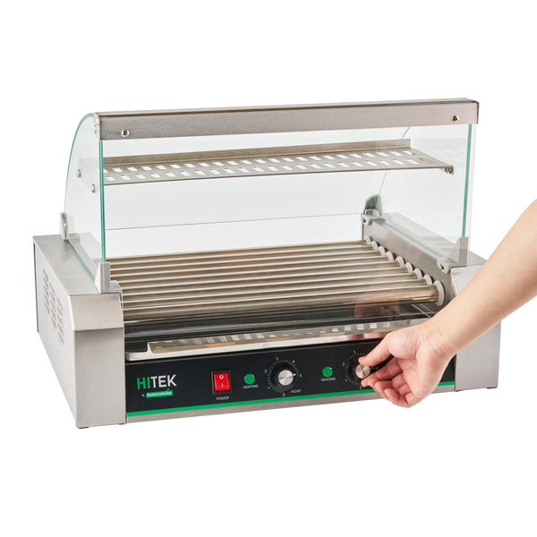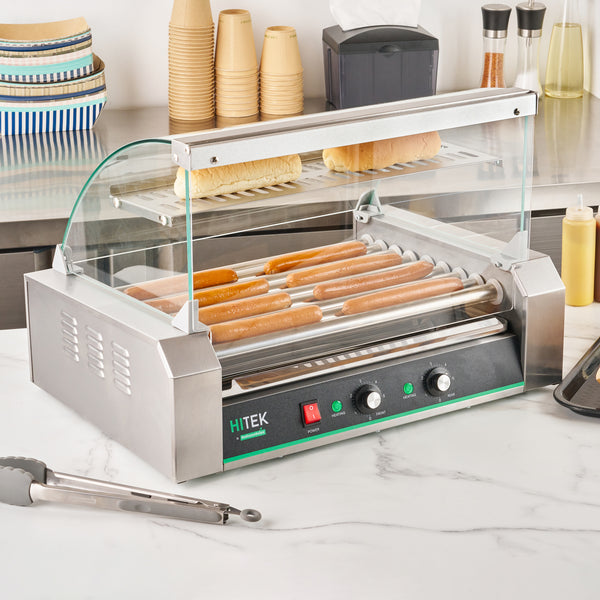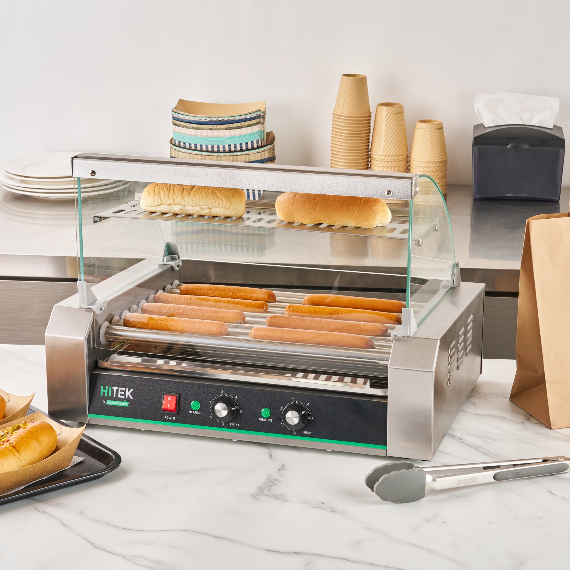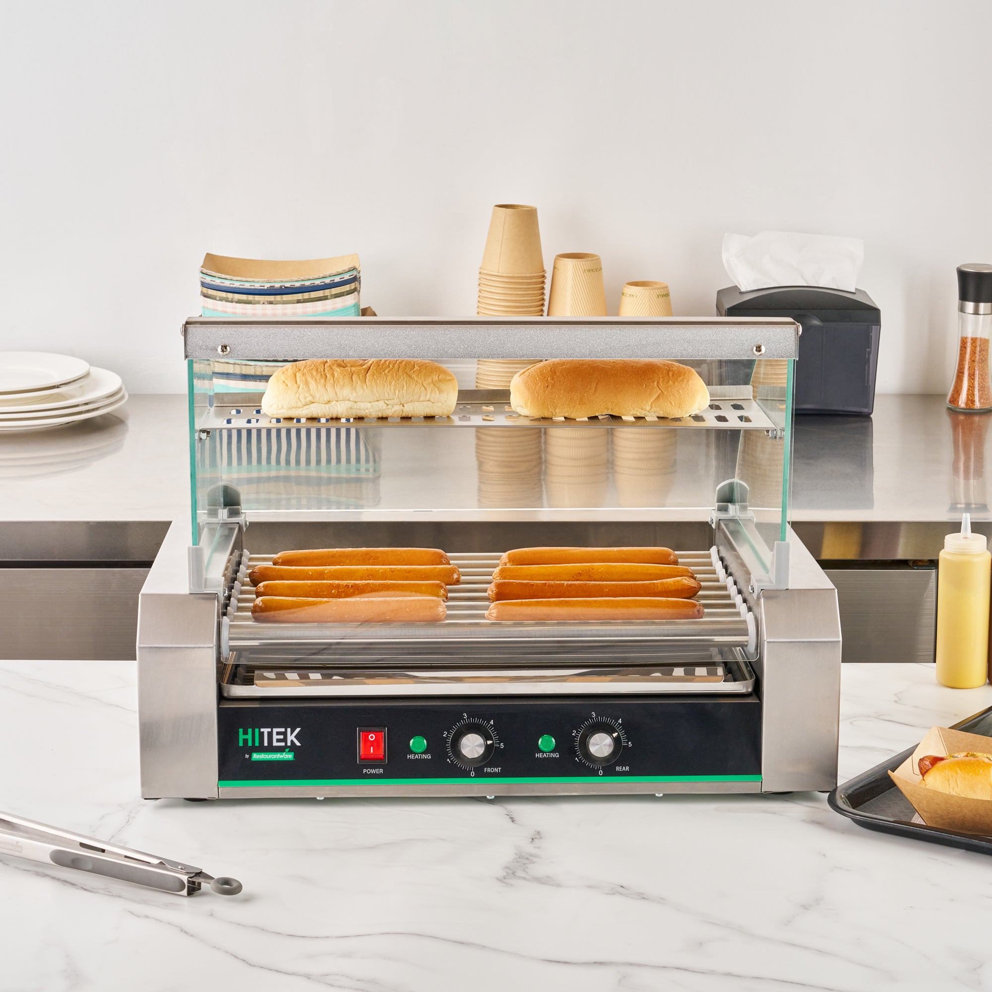 Elevate your foodservice operations with our Hi Tek Hot Dog Roller Grill Warmer, designed to meet the demands of busy commercial settings. This efficient hot dog roller grill fits 24 hot dogs and 4 buns, ensuring you can serve multiple customers quickly. Equipped with 9 stainless steel rollers that rotate at 3.8 r/min, this hot dog roller machine ensures even cooking every time. Operating at 1200W power and 110V 60Hz, this unit delivers reliable performance with a motor power of 14W and 5RBM/min. The temperature range of 122F-482F allows for precise cooking, making it ideal for a variety of hot dog recipes. Built with a toughened glass cover and an acrylic glass door, this hot dog roller machine ensures durability and safety. These hot dog roller grills come with a sneeze guard, providing added hygiene for your foodservice environment. Measuring 23 inches in length by 16.25 inches in width by 16 inches in height, this compact yet substantial hot dog grill fits seamlessly into any kitchen space.Sold in a 1 count box.