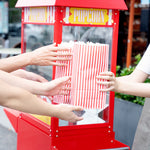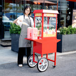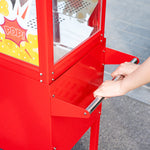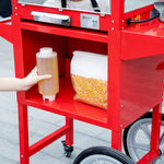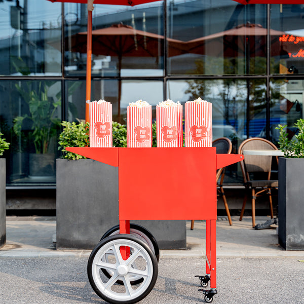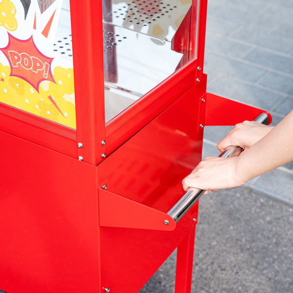 This popcorn maker stand is constructed with durable stainless steel, ensuring long-lasting use. Its red finish adds a pop of color, making it stand out at outdoor carnivals or large parties.