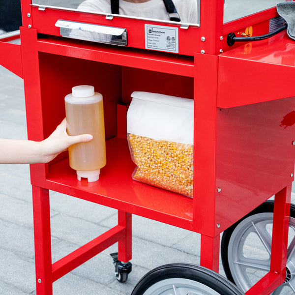 This popcorn maker cart is designed with a side shelf for prepping orders or keeping popcorn buckets. Excellent for packing or displaying ready-to-eat popcorn.