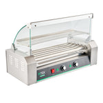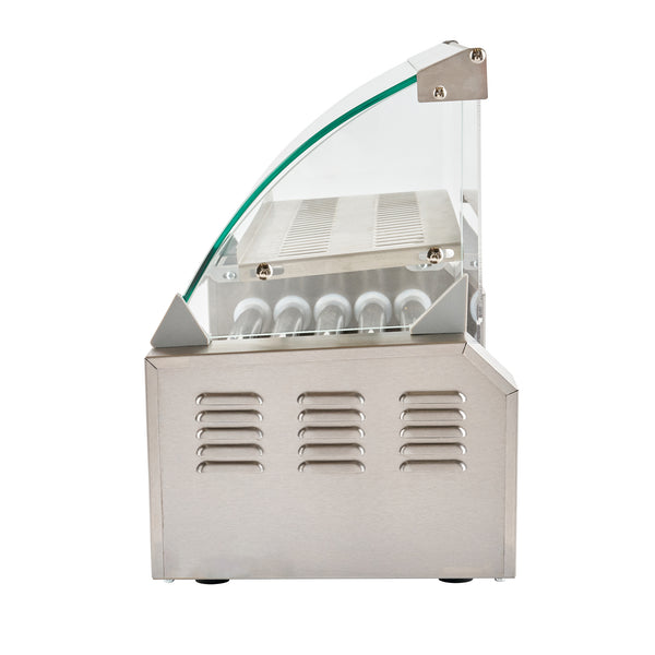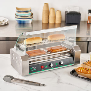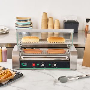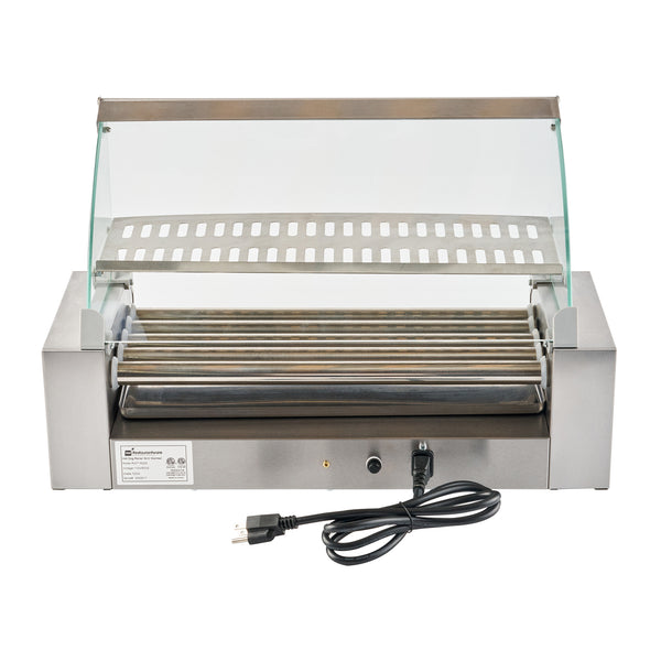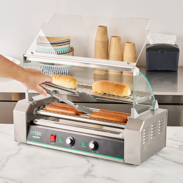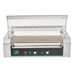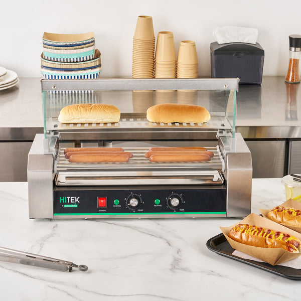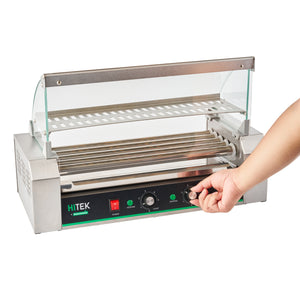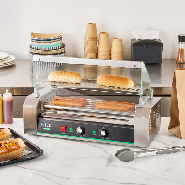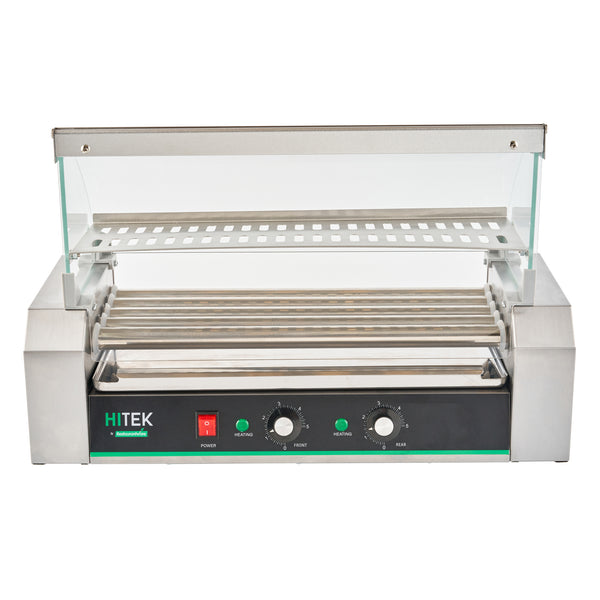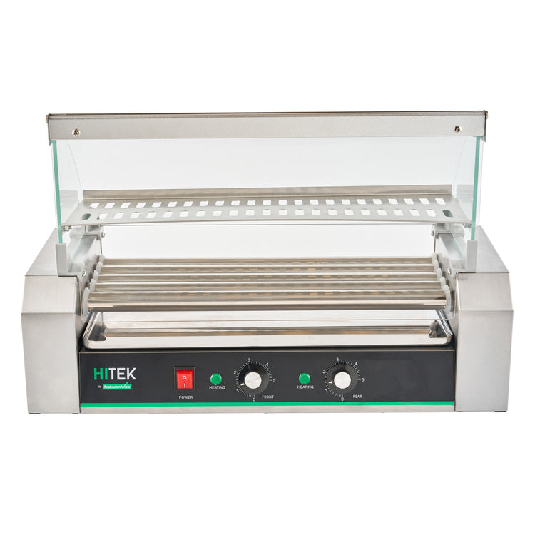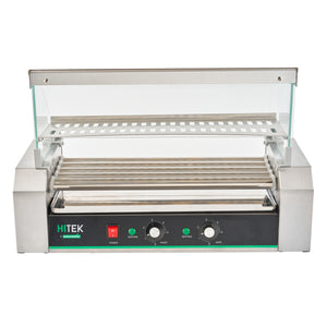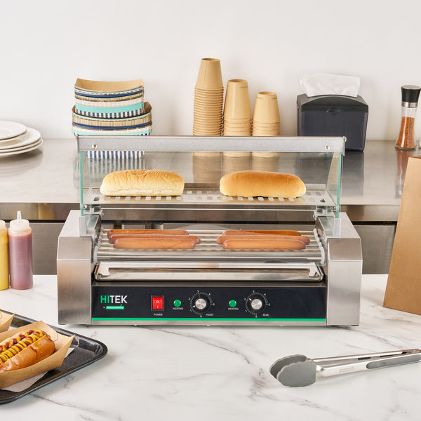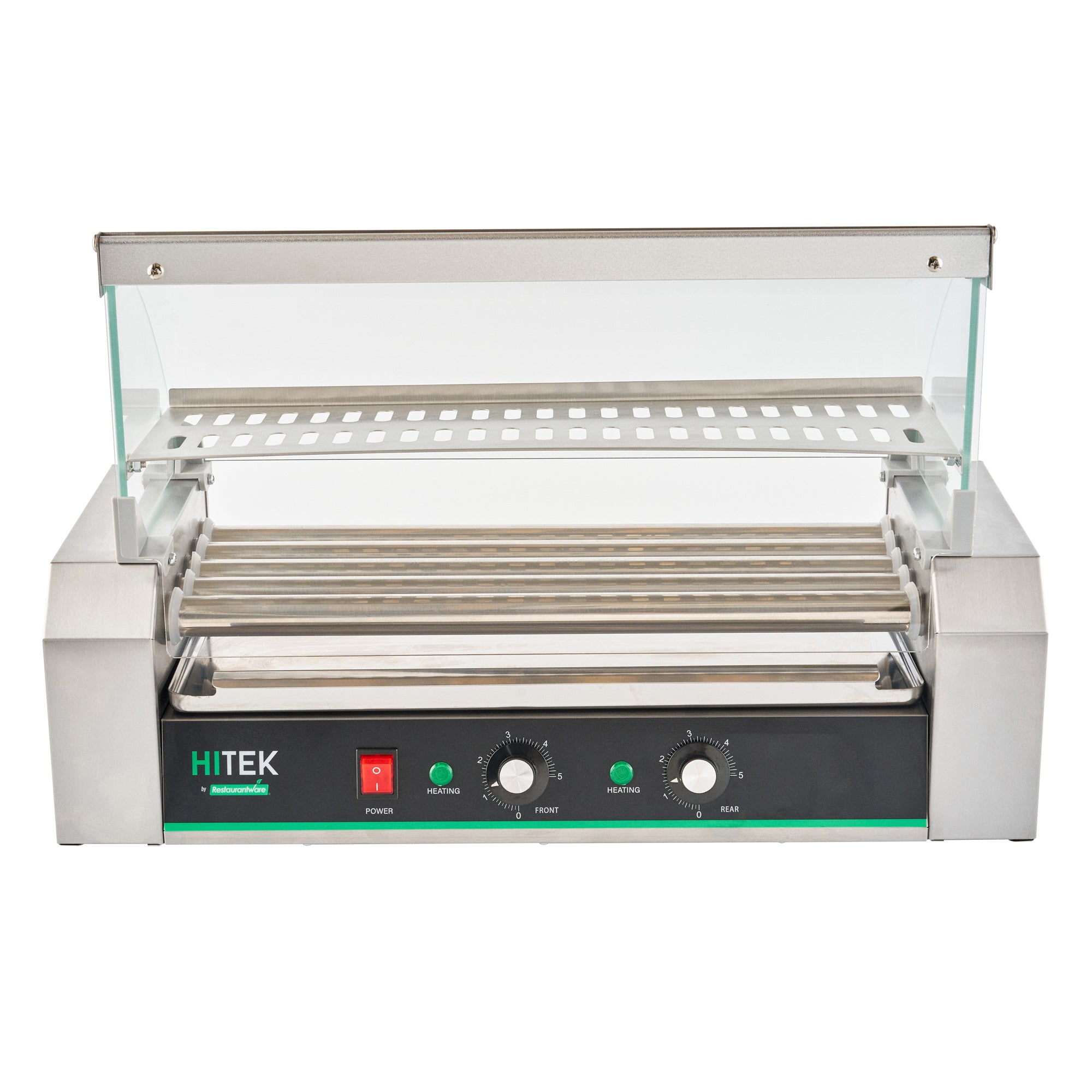 Effortlessly prepare and warm up to 12 hot dogs at a time with our Hi Tek Stainless Steel Hot Dog Roller Grill Warmer. This hot dog roller grill features 5 stainless steel rollers that ensure even cooking and consistent results. With a power rating of 700W and operating on 110V 60Hz, these hot dog roller grills boast a robust 14W motor with a rotation speed of 5RBM/min and roller speed of 3.8r/min for efficient operation. The grill operates within a temperature range of 122F-482F, providing precise control for perfect cooking. For added safety and durability, these hot dog grill machines include a toughened glass cover and an acrylic glass door. The added bun warmer shelf ensures that buns are kept warm and ready to serve, enhancing overall efficiency and customer satisfaction. Measuring 23 inches in length by 10.75 inches in width by 15 inches in height, this compact hot dog roller machine fits seamlessly into any commercial kitchen or foodservice setup. Sold in a 1 count box.