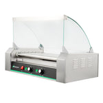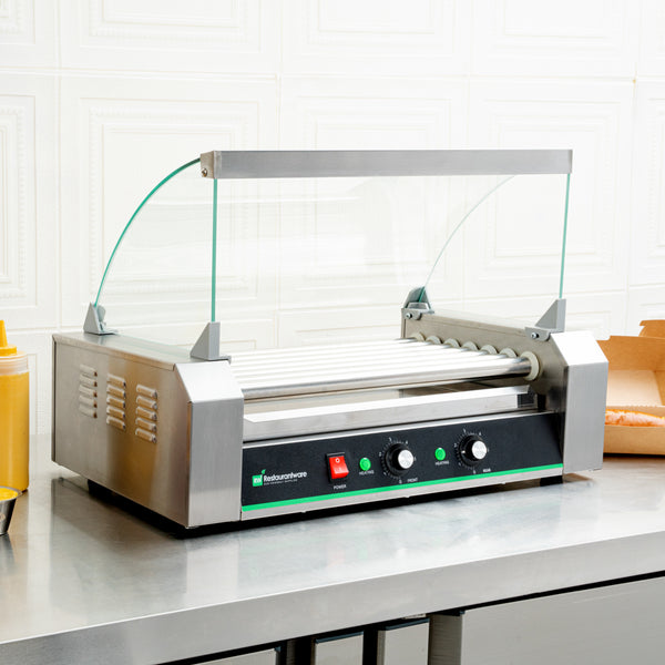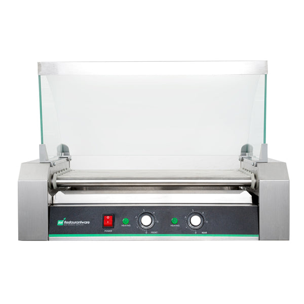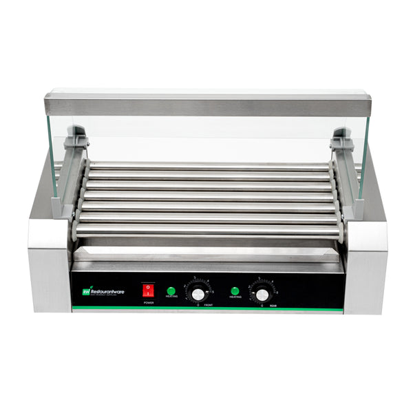 Featuring dual temperature controls, this hot dog roller grill allows for independent front and rear operations. Conveniently cook two meals at once!