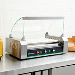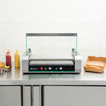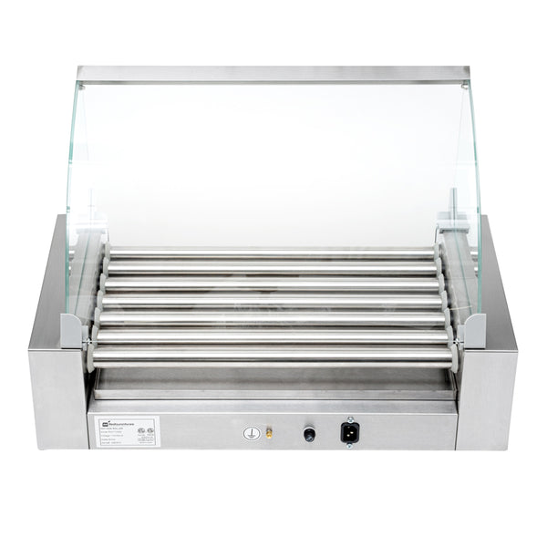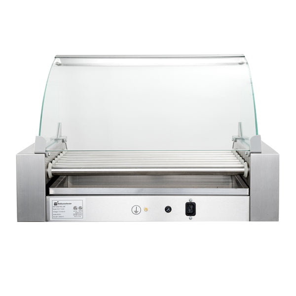 This hot dog cooker is equipped with a curved glass sneeze guard to protect foods from unwanted, external substances. Maintain your food station!
