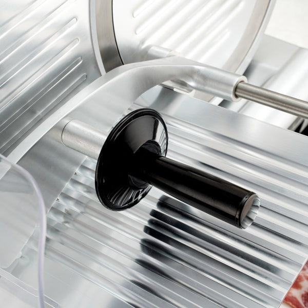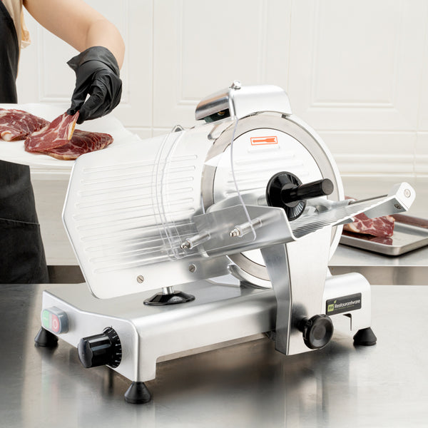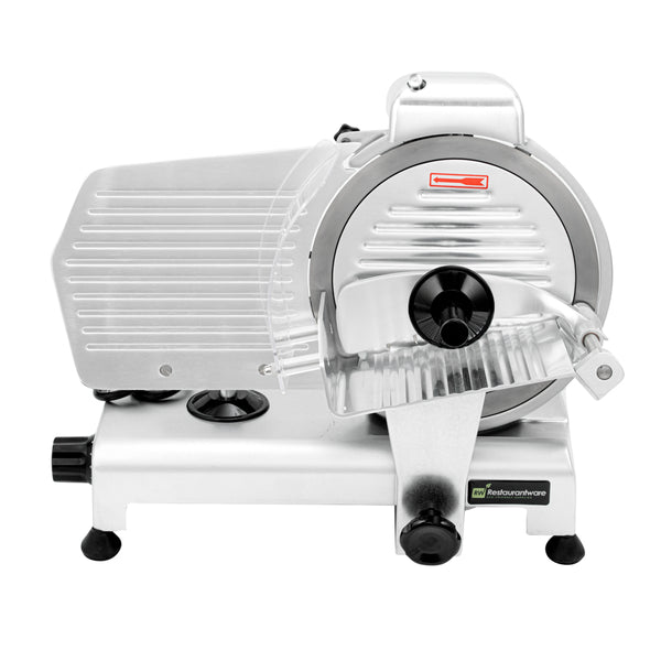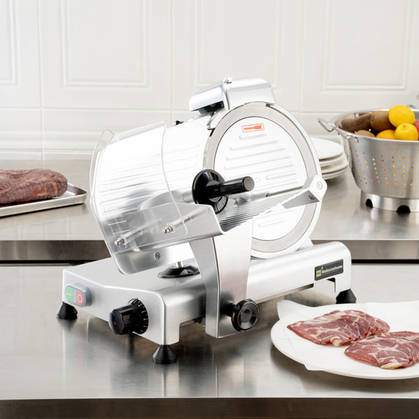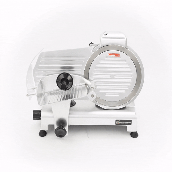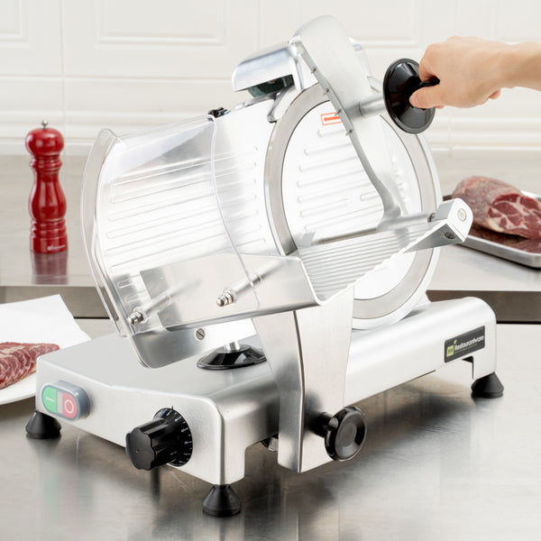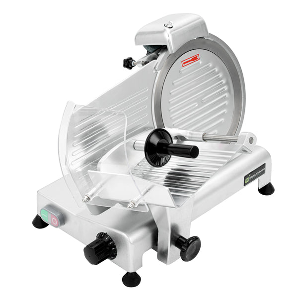 Use our Hi Tek Stainless Steel Manual Gravity Feed Meat Slicer to quickly prep ingredients. Featuring a 0.25 horsepower and 320W operation, this light-duty slicer allows you to slice meats, vegetables, and other ingredients with ease. This slicer is rated for up to 2 hours of daily use and is excellent for operators that use the slicer for less than 1 hour a day. With a built-in sharpener, this gravity feed meat slicer ensures that the blade will stay keen throughout use. Featuring a 10-inch stainless steel blade, this manual meat slicer is built to last. This meat slicer has a fixed ring guard, so you can avoid unwanted contact with the blade while in use. Featuring a removable carriage, this meat slicer is effortless to clean. Made to work with standard U.S. power outlets, this deli meat slicer is rated for 120V. This kitchen slicer comes with a NEMA 5-15P plug. This gravity feed meat slicer measures 21 inches long by 17 inches wide by 16 inches tall. Shipped in a 1 count box.