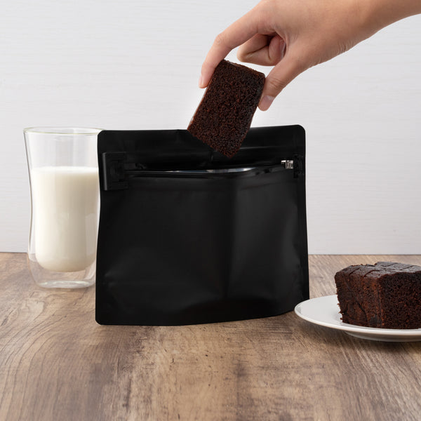 These exit bags feature a child-resistant lock, allowing you to pack up cookies, brownies, or gummies without worrying about children getting their hands on them. To open the child lock, push down the fingerprint button with one hand while pulling the zipper tab with the other.