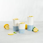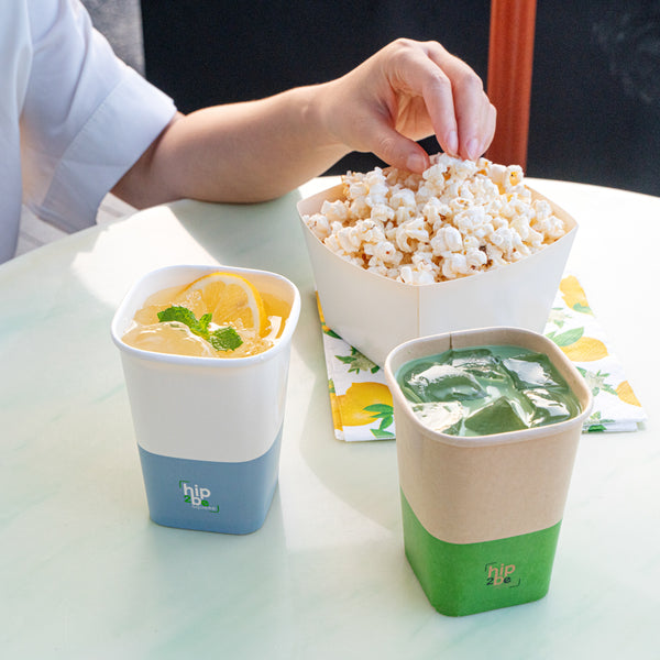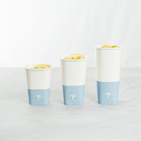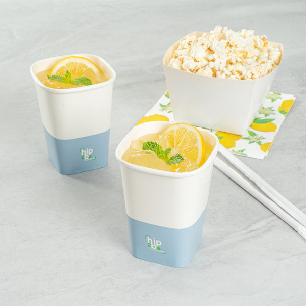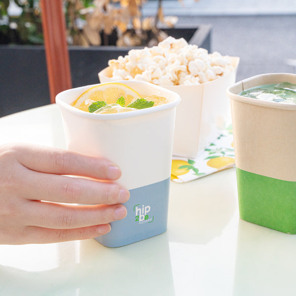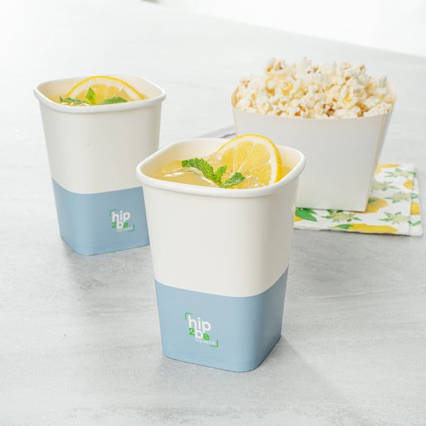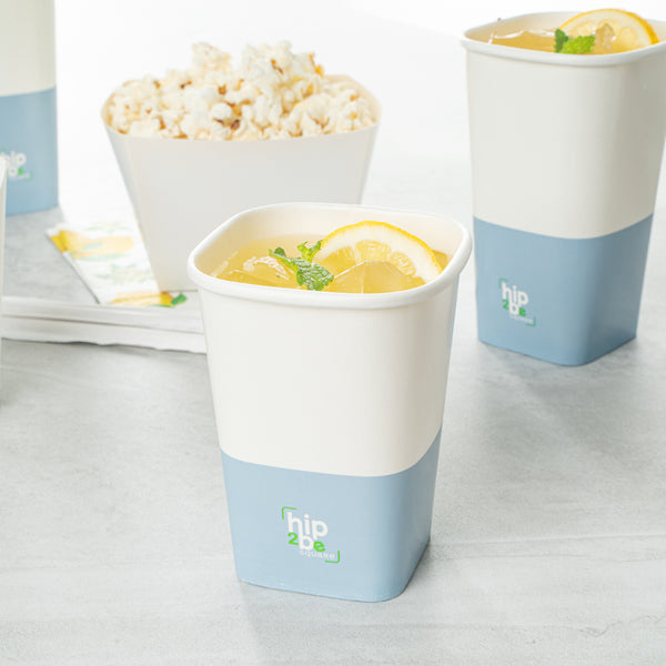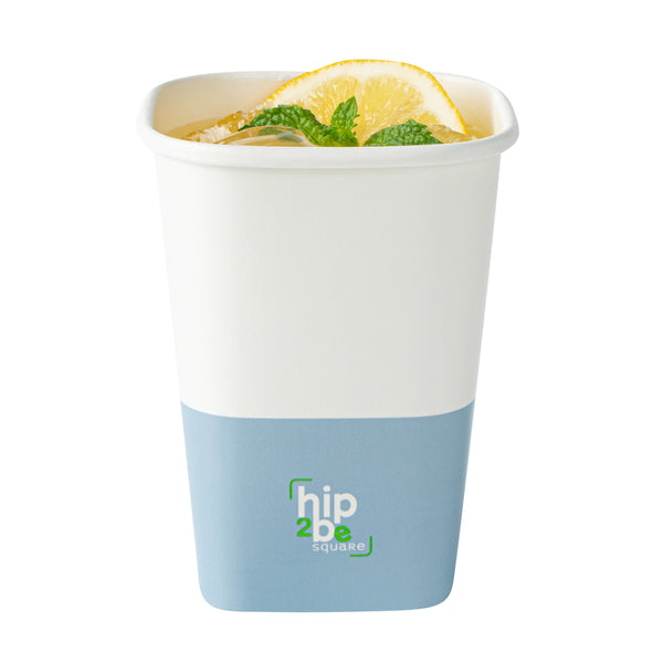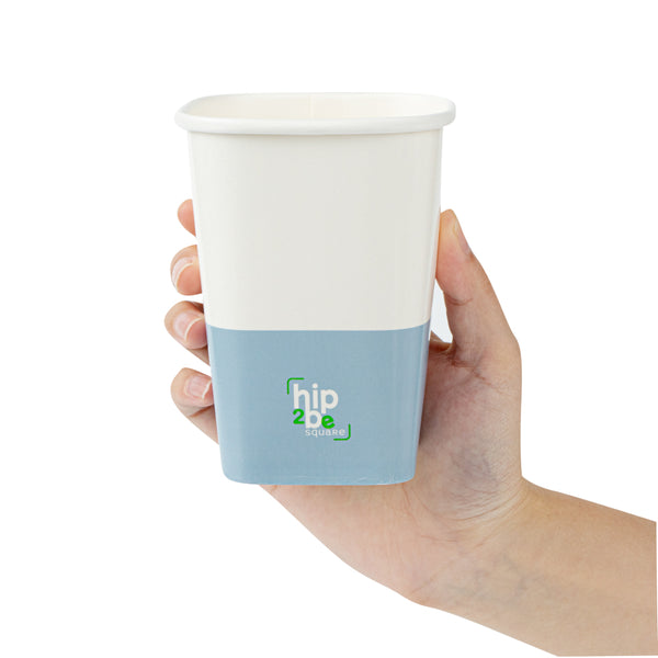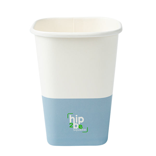 Easily drink and serve hot or cold beverages while on the go or at an event with our Hip 2 Be Square 12-Ounce White and Blue Paper Hot / Cold Drinking Cup. These 12-ounce square paper cups have a distinctive attractive appearance that also holds a sufficient capacity for coffee lovers. The single-wall construction on these hot chocolate paper cups allows for a more solid hold while serving or drinking beverages. These paper hot cups are conveniently recyclable for easy cleanup and waste reduction. The PE lining in these disposable hot cups is built to avoid any leakage or spills. These paper drinking cups have a "Hip 2 Be Square" text for your guests to enjoy. To avoid a crammed storage room, these paper cups for hot drinks are stackable. The white and blue paper design in these paper coffee cups adds a touch of color while maintaining a classic feel. Easily pair these paper hot cups with our compatible Hip 2 Be Square lids to perfectly seal your beverages during transport and avoid any potential messy spills (SKU: RWA1108B and RWA1109C). These tea paper cups measure 3.25 in length by 3.25 in width by 4.25 in height. Sold in a 25 count box. Hip 2 Be Square sippy cup lids are available and sold separately.