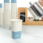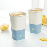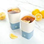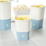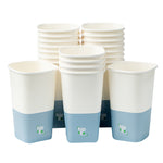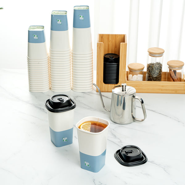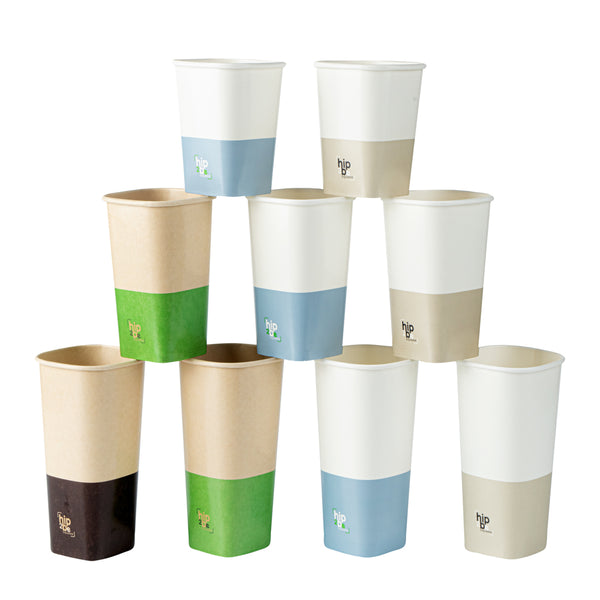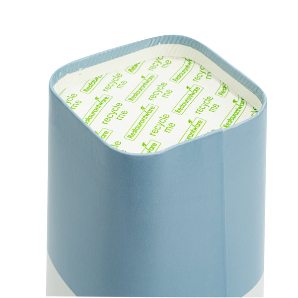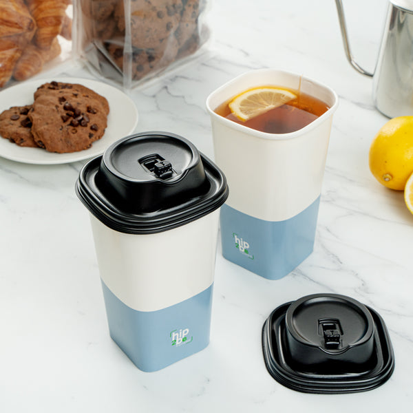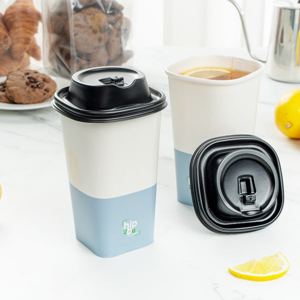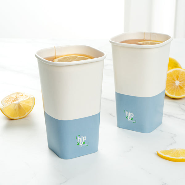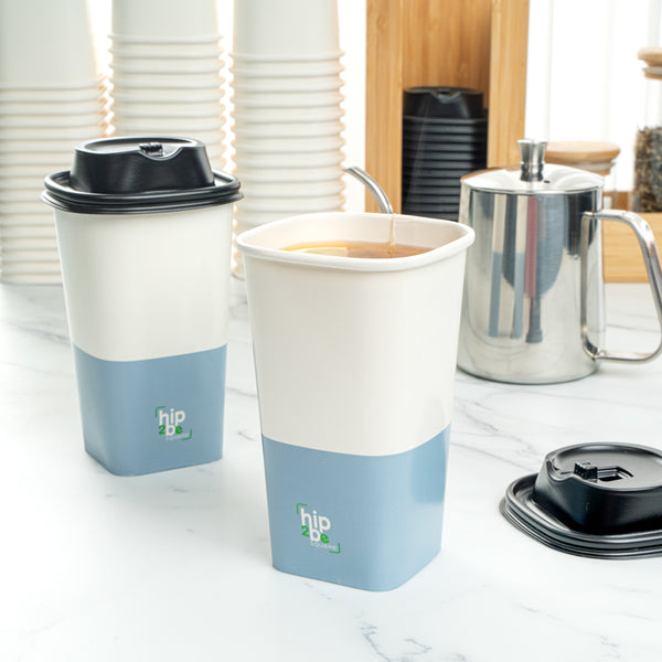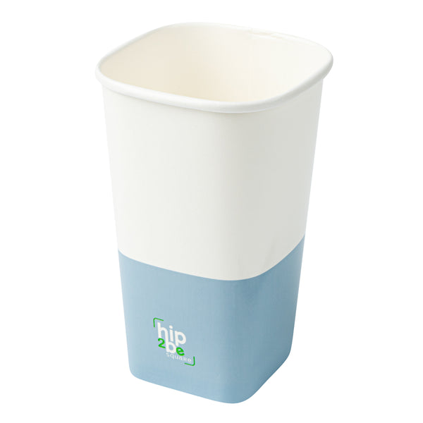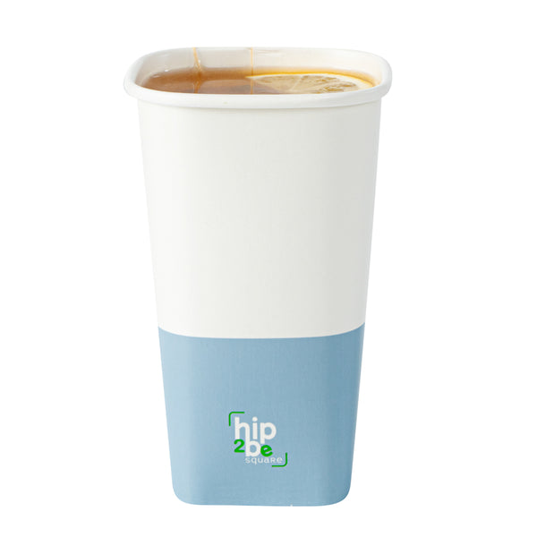Drink all kinds of hot or cold beverages with our Hip 2 Be Square 16-ounce White and Blue Paper Hot / Cold Drinking Cups. These paper drinking cups are a 16-ounce size for customers who love to enjoy a sufficient amount of coffee or tea. With a versatile design, these paper cups are suited for all kinds of warm or cool beverages. The square construction in these paper cups for hot drinks create a unique modern appearance to add at your cafe or catering event. These paper cups for cold drinks have a double P.E lining to avoid any potential leakage or spills when on the go. For a more comfortable and secure grip, these paper coffee cups are built with a single-wall. These hot chocolate paper cups have a "Hip 2 Be Square Text" on the bottom for a fun touch. For simple clean up and an organized supply room, these tea paper cups are easily stackable and disposable. The white and blue paper finish in these paper coffee cups adds a touch of color while maintaining a classic feel. These paper drinking cups are compatible with our Hip 2 Be Square lids (SKU: RWA1108B and RWA1109C) and measure 3.25 inches in length by 3.25 inches in width by 5.5 inches in height. Sold in a 25 count box. Hip 2 Be Square sippy and straw cup lids are available and sold separately.