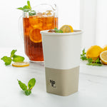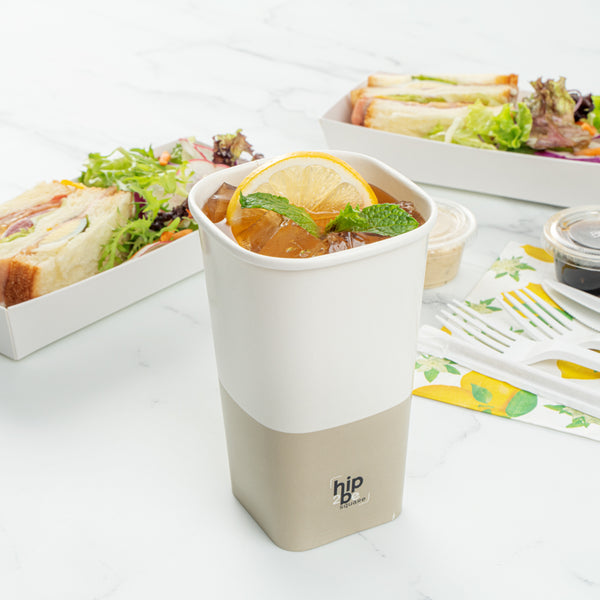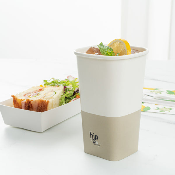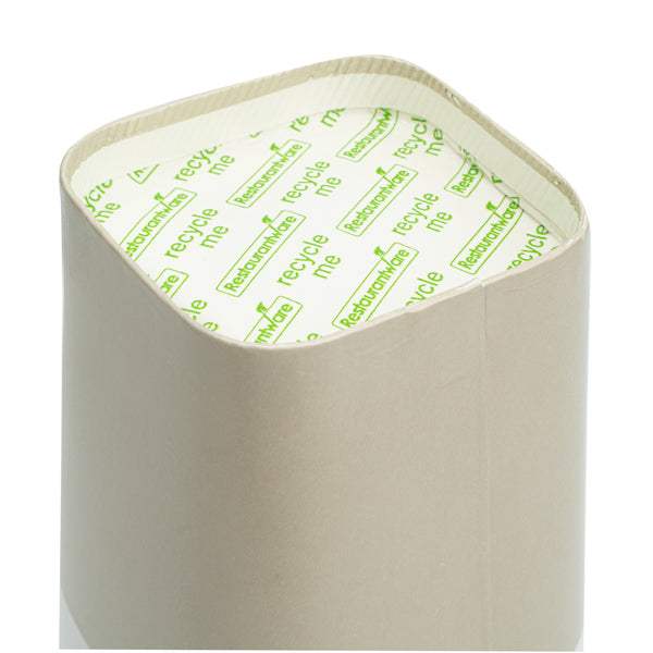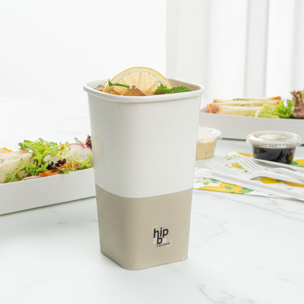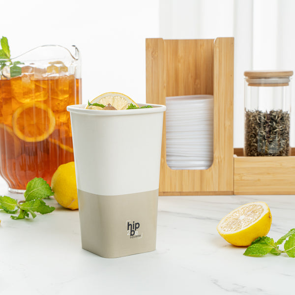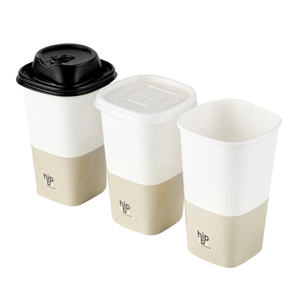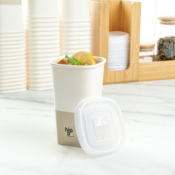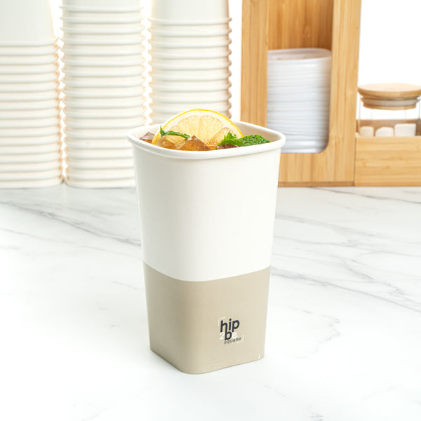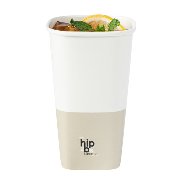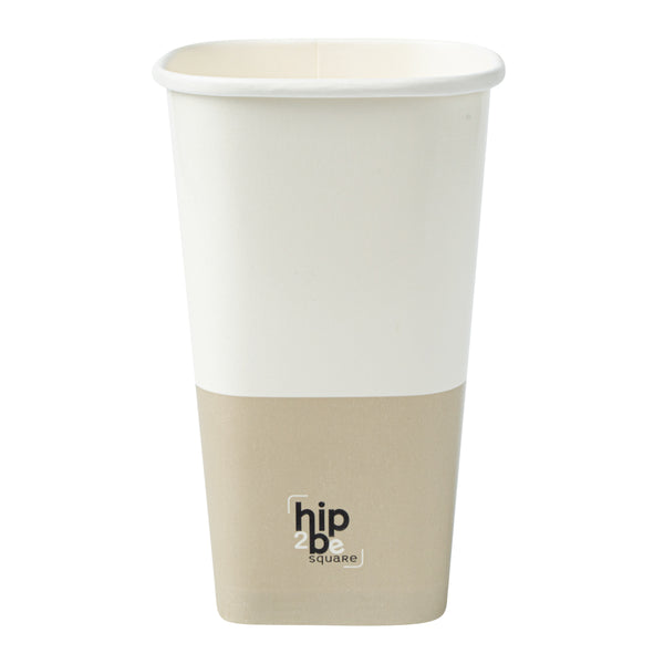 Conveniently serve your customers' favorite warm or cool beverages with our Hip 2 Be Square 16-ounce White and Taupe Paper Hot / Cold Drinking Cups. These 16-ounce hot cups have a large capacity to hold warm hot chocolate or iced coffee. The single-wall construction of these paper drinking cups allow for a comfy and secure grip while drinking. For a modern touch at your cafe or food service establishment, these paper cups have a square design. The double PE lining of these tea paper cups stops any potential spills or leakage from occurring. To leave your guests with an unforgettable drinking experience, these hot chocolate paper cups have a fun "Hip 2 Be Square" text. These paper cups for cold drinks are easily stackable and disposable for a simple cleaning process. For a sophisticated appearance, these tea paper cups are crafted with white and taupe-colored paper. These paper cups for hot drinks are compatible with our Hip 2 Be Square lids (SKU: RWA1108B and RWA1109C) and measure 3.25 inches in length by 3.25 inches in width by 5.5 inches in height. Sold in a 25 count box. Hip 2 Be Square sippy and straw cup lids are available and sold separately.