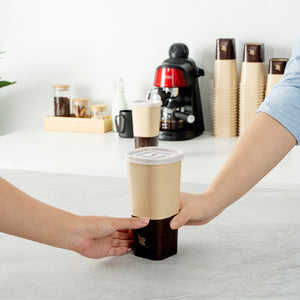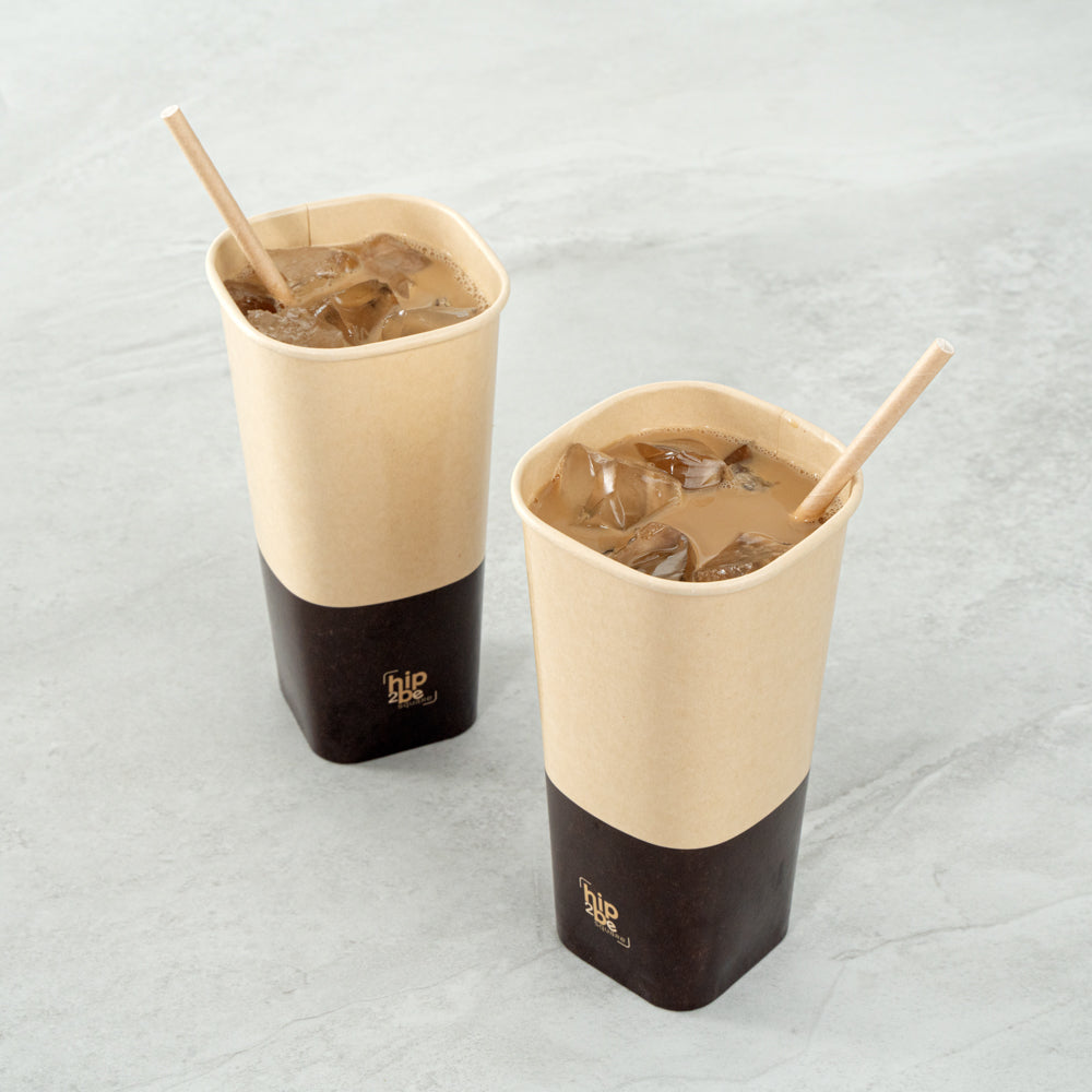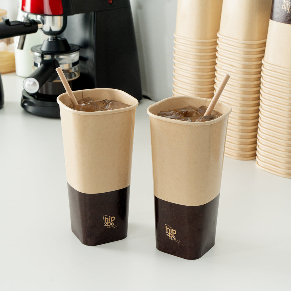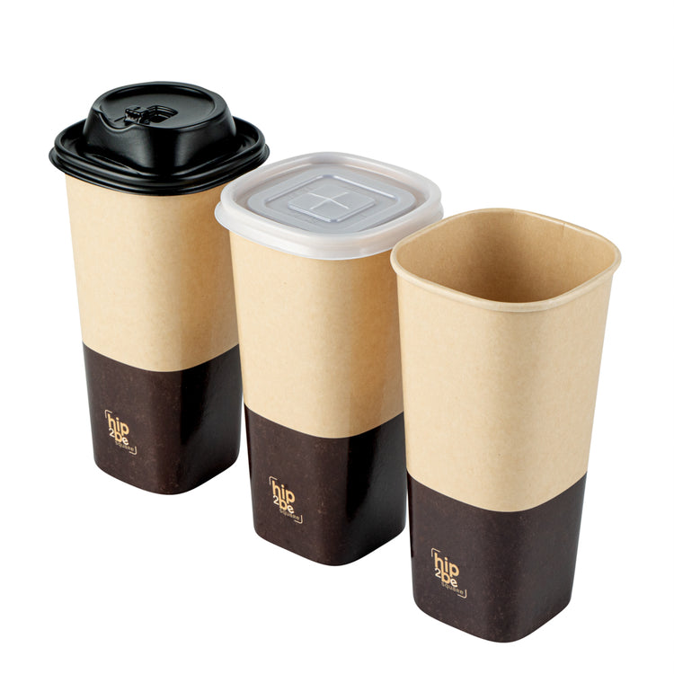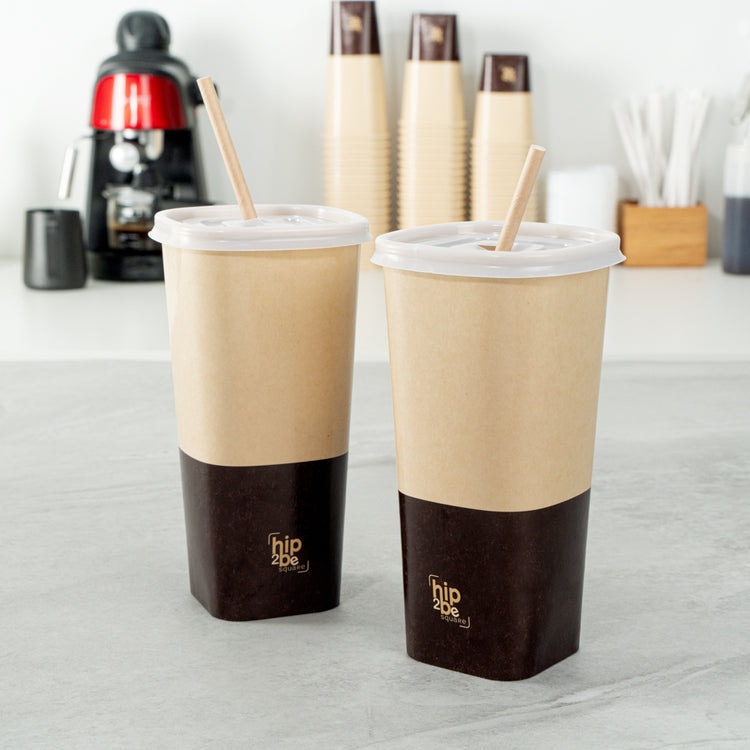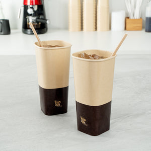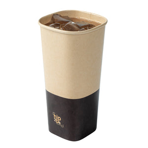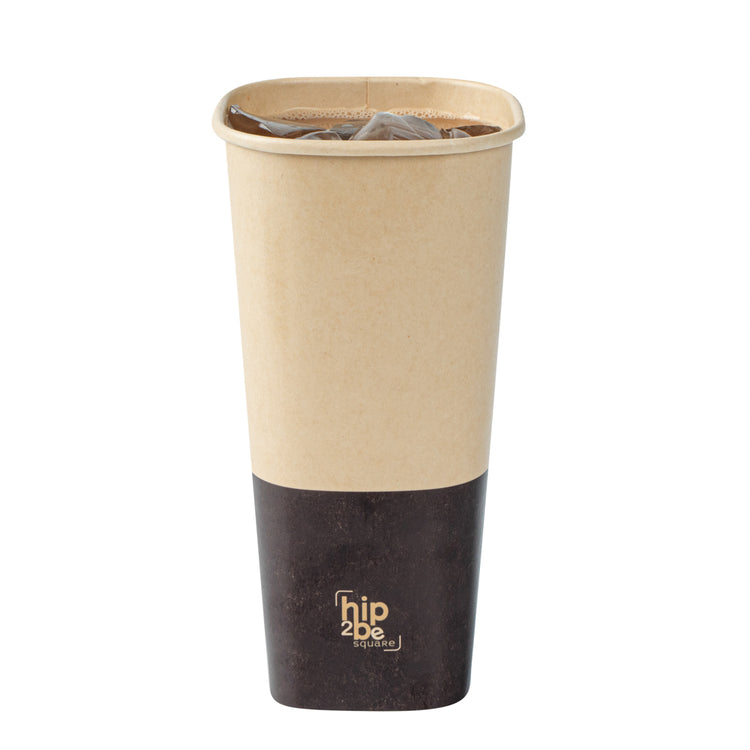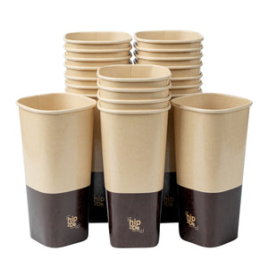 Serve a variety of drinks with our Hip 2 Be Square 22 oz Kraft and Brown Paper Hot / Cold Drinking Cup. These hot and cold cups have an innovative square shape to provide a unique flair to your beverages. Designed to withstand both hot and cold drinks, these disposable paper cups are versatile to be used for freshly brewed coffee or refreshing iced teas. With a single wall construction, these square paper cups provide a sturdy grip, allowing guests to take their drinks on the go. These paper cups feature a double PE lining to reduce the risk of any spills or leaks. To maximize storage space in your kitchen, these square coffee cups are conveniently stackable. These disposable cups feature a kraft and brown finish to complement the rest of your supplies at your cafe, restaurant, or coffee shop. Pair these coffee cups with our coordinating Hip 2 Be Square lids to easily transport drinks (SKU: RWA1108B and RWA1109C). These 22-ounce cups measure 3.25 inches in length by 3.25 inches in width by 6.75 inches in height. Sold in a 500 count box.