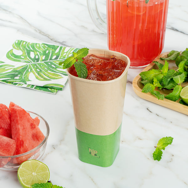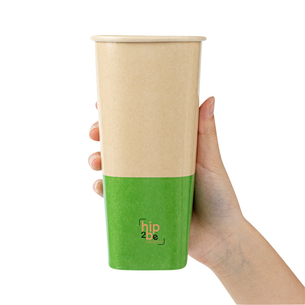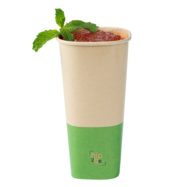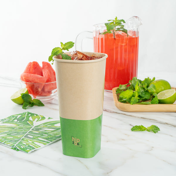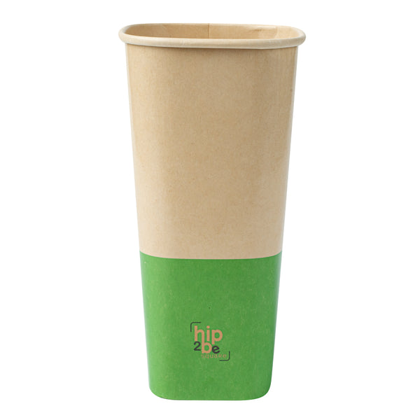 Effortlessly serve hot teas or ice-cold lemonades with our Hip 2 Be Square 22 oz Kraft and Green Paper Hot / Cold Drinking Cups. These disposable cups are designed with a unique square shape to add an eye-catching element to your beverages. Made to hold hot and cold drinks, these square coffee cups are perfect for serving any drink at your coffee shop, food truck, or restaurant. Constructed with a single wall, these sturdy paper cups provide a comfortable grip while transporting beverages. These disposable paper cups feature a double PE lining for added durability to avoid any leaks or spills. To save on storage space in your kitchen, these hot and cold cups can easily be stacked. With a kraft and green finish, these square paper cups are stylish and complement the rest of your packaging supplies. Pair these coffee cups with our Hip 2 Be Square lids to facilitate your to go or delivery services (SKU: RWA1108B and RWA1109C). These 22-ounce cups measure 3.25 inches long by 3.25 inches wide by 6.75 inches tall. Sold in a 25 count box.