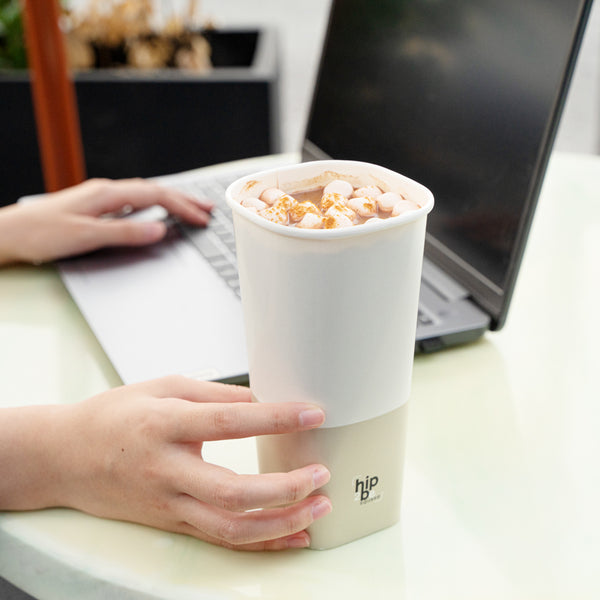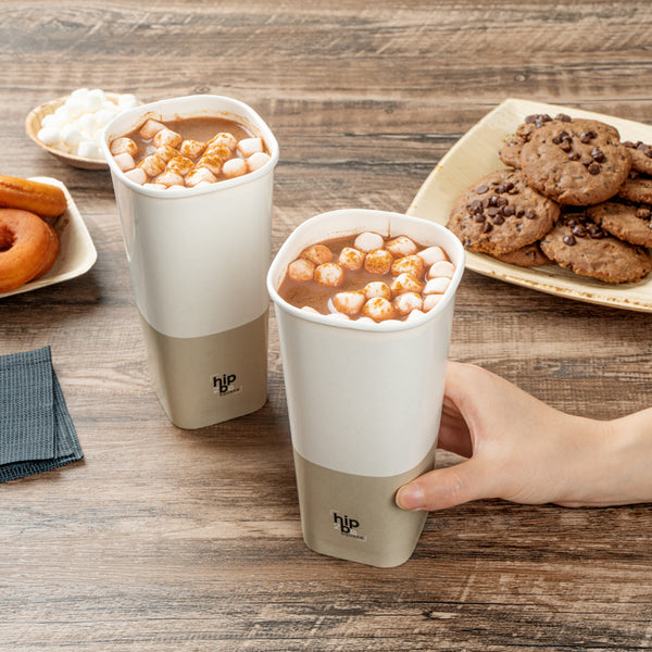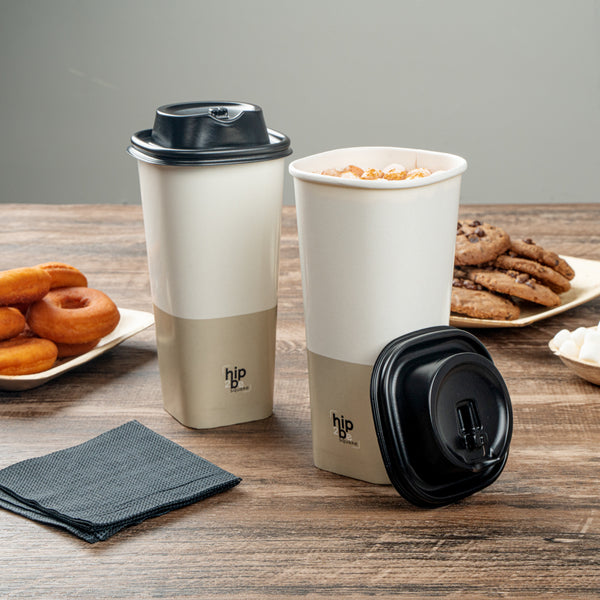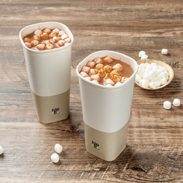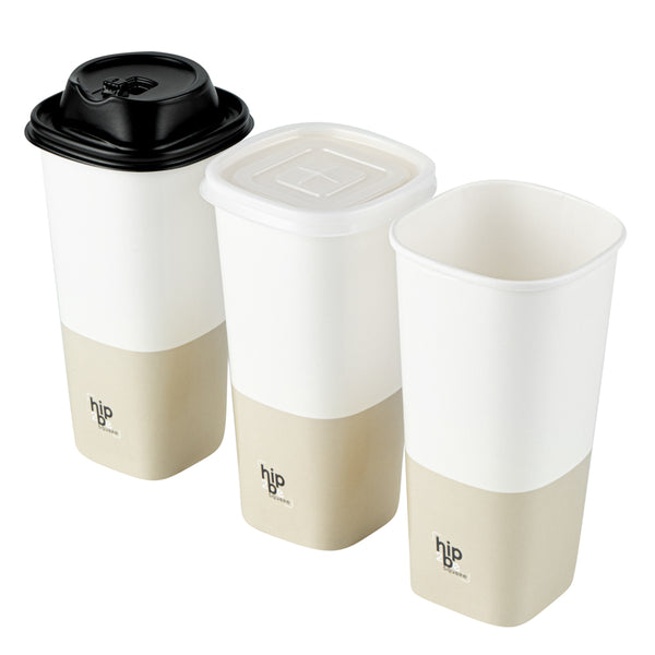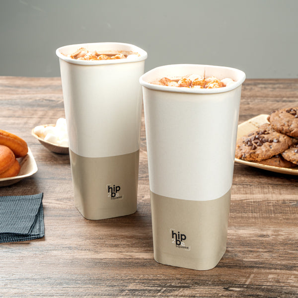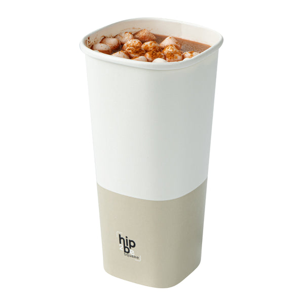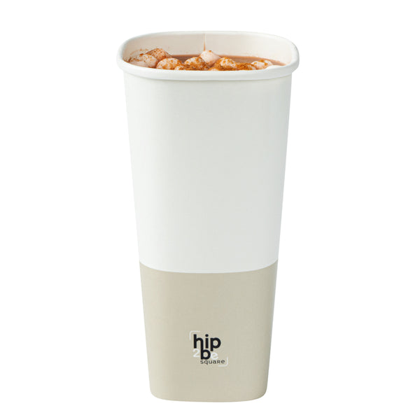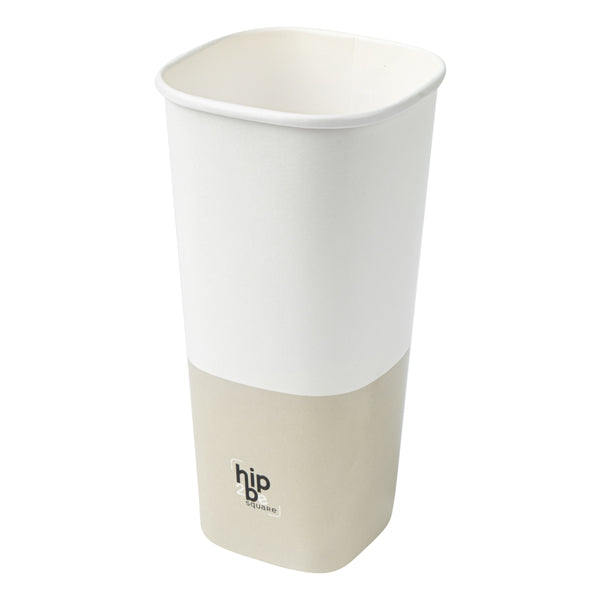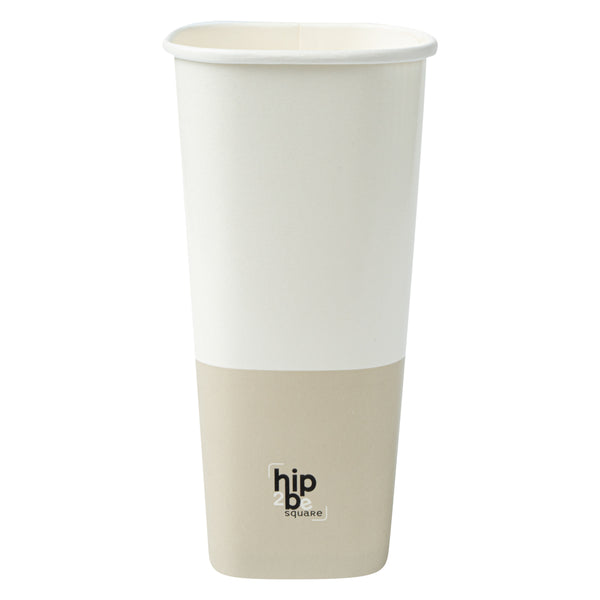 Provide guests with a unique drinking experience with our Hip 2 Be Square 22 oz White and Taupe Paper Hot / Cold Drinking Cup. These paper cups feature an innovative square design to add a stylish touch to your beverages. Built to hold both hot and cold drinks, these square coffee cups are versatile for use at your food truck, cafe, or coffee shop. These hot and cold cups feature a single wall design for a comfortable grip while taking coffee or tea on the go. Plus, they have a double PE lining to avoid beverages from seeping through. With a stackable design, these disposable cups save storage space so you can keep supplies on hand without the worry of clutter. These coffee cups have a classic white and taupe finish to fit in with the rest of your supplies. Pair these square paper cups with our coordinating Hip 2 Be Square lids to avoid spills or leaks while transporting drinks (SKU: RWA1108B and RWA1109C). These 22-ounce disposable paper cups measure 3.25 inches long by 3.25 inches wide by 6.75 inches tall. Sold in a 25 count box.