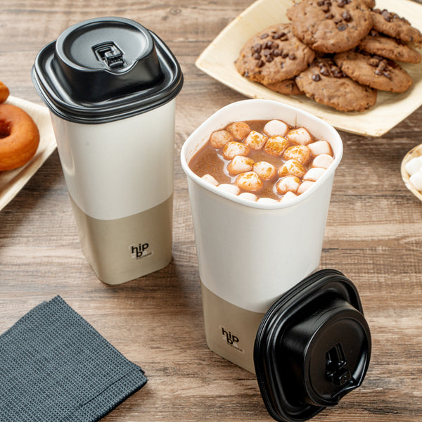 Provide guests with a unique drinking experience with our Hip 2 Be Square 22 oz White and Taupe Paper Hot / Cold Drinking Cup. These paper cups feature an innovative square design to add a stylish touch to your beverages. Built to hold both hot and cold drinks, these square coffee cups are versatile for use at your food truck, cafe, or coffee shop. These hot and cold cups feature a single wall design for a comfortable grip while taking coffee or tea on the go. Plus, they have a double PE lining to avoid beverages from seeping through. With a stackable design, these disposable cups save storage space so you can keep supplies on hand without the worry of clutter. These coffee cups have a classic white and taupe finish to fit in with the rest of your supplies. Pair these square paper cups with our coordinating Hip 2 Be Square lids to avoid spills or leaks while transporting drinks (SKU: RWA1108B and RWA1109C). These 22-ounce disposable paper cups measure 3.25 inches long by 3.25 inches wide by 6.75 inches tall. Sold in a 500 count box.