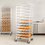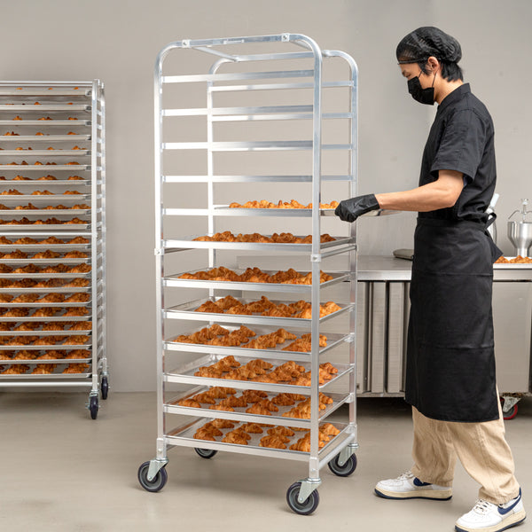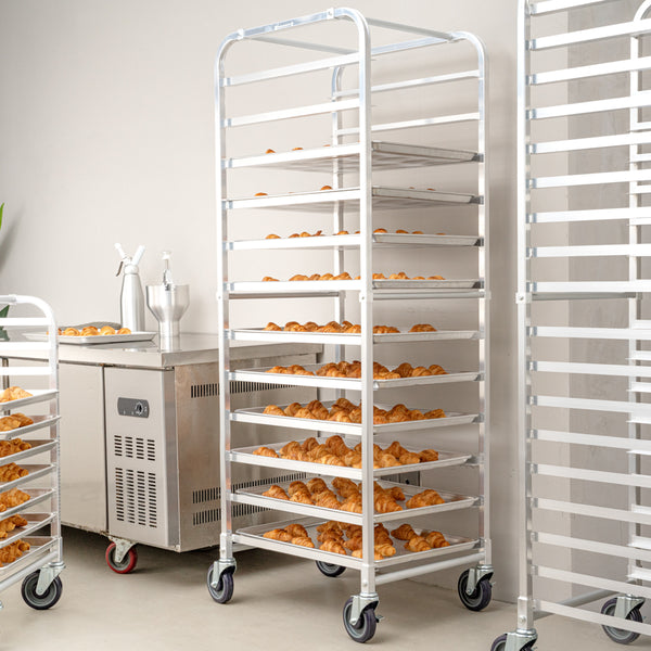 For storing various baking sheets together, this bun rack can hold 10, 12, 18, or 20 pans at once. Have ample space for all of your supplies with 5-inch or 3-inch shelf spacing!