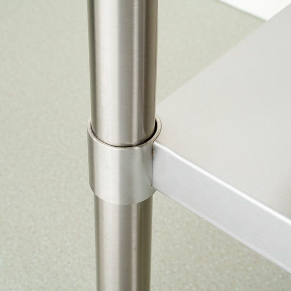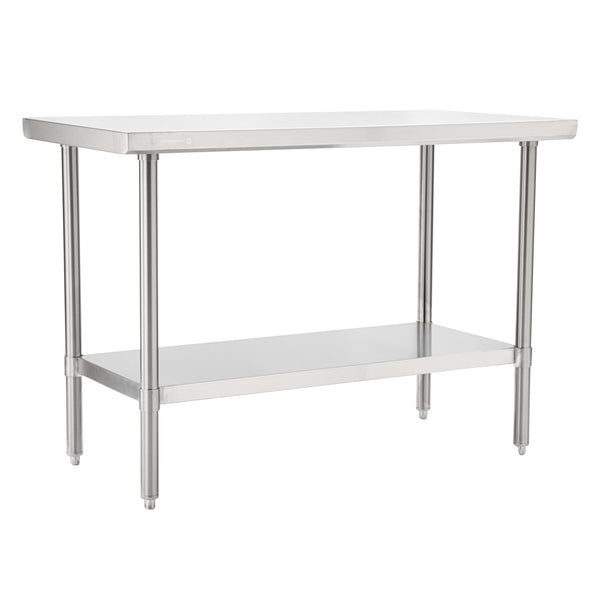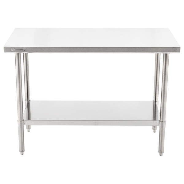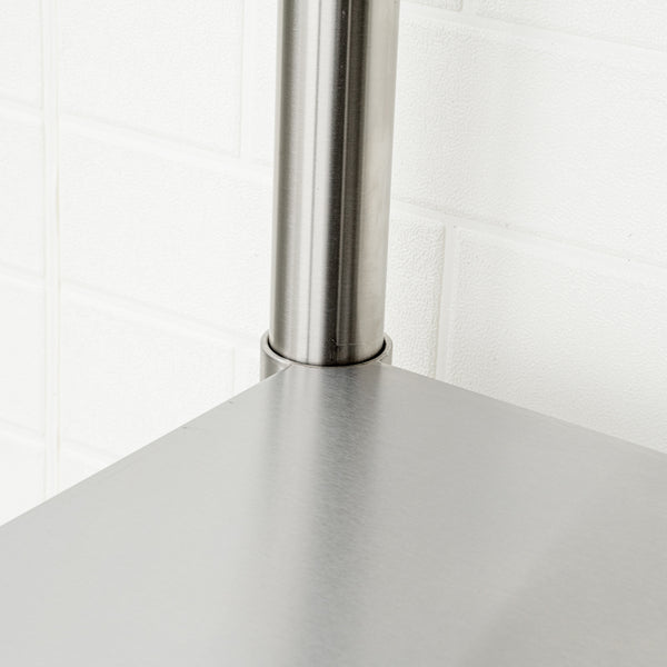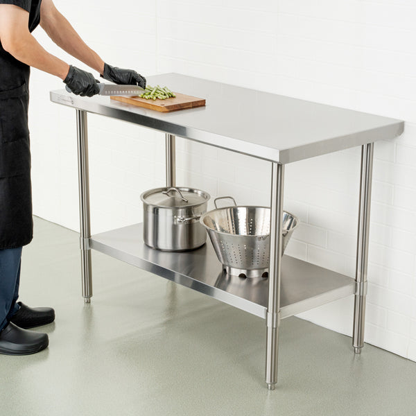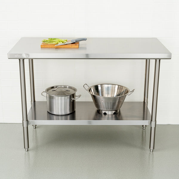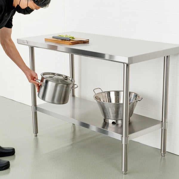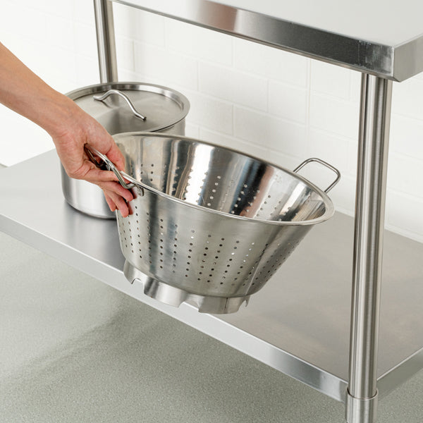 The top shelf of these work tables holds hundreds of pounds of heavy equipment such as espresso machines or mixers. Most of our metal tables have an undershelf for extra storage for bowls, bins, or ingredients.
