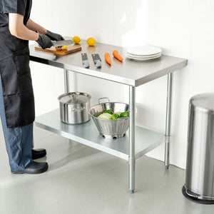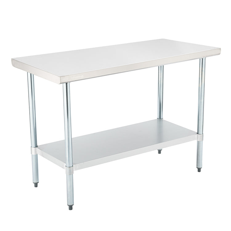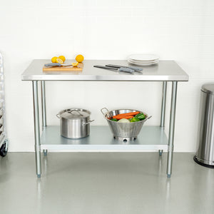Create ample space for making tacos or cookies with our Kitchen Tek 18-Gauge 304 Stainless Steel Commercial Work Table. Featuring galvanized legs and an undershelf, this steel work table keeps from corroding to protect from spills over time. The undershelf of this stainless steel prep table holds up to 340 pounds, while the top shelf holds up to 460 pounds of hefty equipment. To change the height to meet code requirements, this commercial work table can adjust 3 to 4 centimeters. To assemble in no time, this food prep table includes a wrench and a set of screws. Featuring a top shelf with an 18-inch gauge thickness, this commercial restaurant table measures 24 inches wide by 48 inches long and 34 inches tall. Sold in a 1 count box.