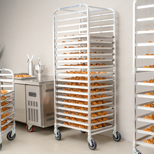 For storing various baking sheets together, this bun rack can hold 10, 12, 18, or 20 pans at once. Have ample space for all of your supplies with 5-inch or 3-inch shelf spacing!