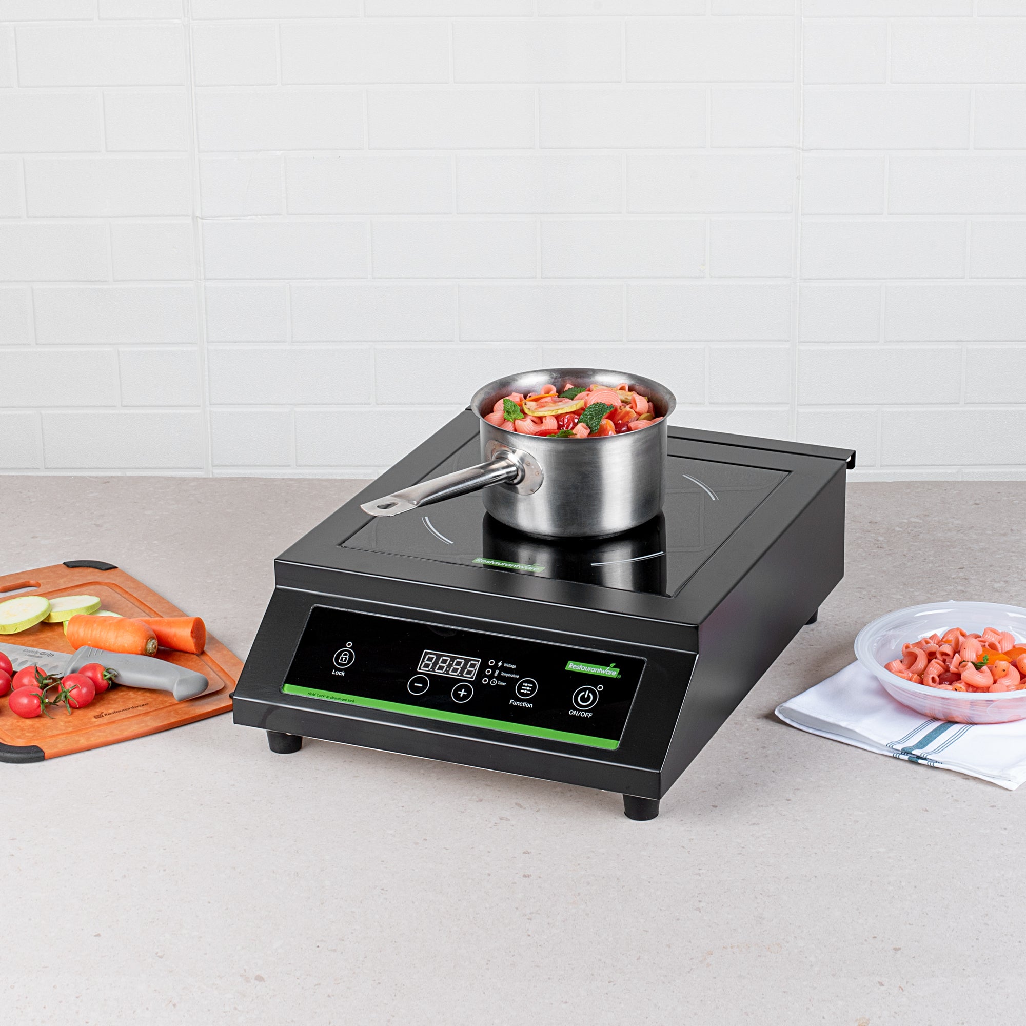 Efficiently elevate your culinary operations with our Kitchen Tek Black Steel Heavy-Duty Induction Cooktop. This induction cooktop features 120 volts and 1800 watts of heating power to rapidly heat pans, streamlining the cooking process at your restaurant, food truck, or catered event. Offering 10 temperature levels from 140F to 465F, this portable induction cooktop provides precise control to suit a wide range of cooking needs. Featuring 10 power levels for wattage, this commercial induction cooktop provides precise control for energy output. Equipped with a sensor touch control panel, this induction burner lets you easily fine-tune the temperature, and wattage, and set a timer to track cooking cycles with precision. With an LED display, this induction stove ensures that settings are easily visible for enhanced accuracy and convenience while cooking. The simple on and off button of this electric induction cooktop ensures easy operation with just a single press. This countertop induction stove is equipped with a lock function to avoid unintended use by securing the settings, ensuring adjustments cannot be made accidentally. Designed with a ceramic plate, this heavy-duty induction cooktop provides even heat distribution and excellent durability, making it easy to clean and maintain while providing reliable cooking performance. The exhaust vent of this portable electric cooktop effectively removes smoke, steam, and odors from the cooking area, ensuring a cleaner and more comfortable kitchen environment. Measuring 19.88 inches in length by 14.96 inches in width by 5.83 inches in height, this countertop black induction burner easily plugs into any 3-prong 15a, 120v outlet. Sold in a 1 count box.