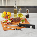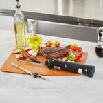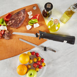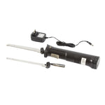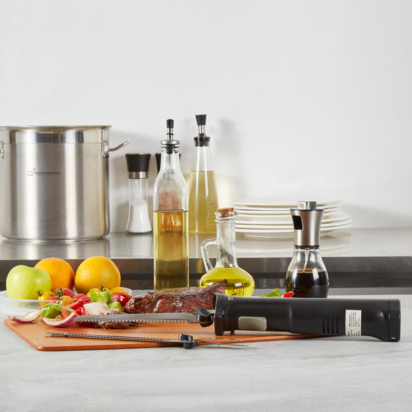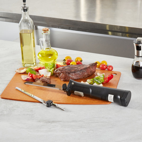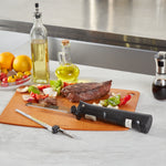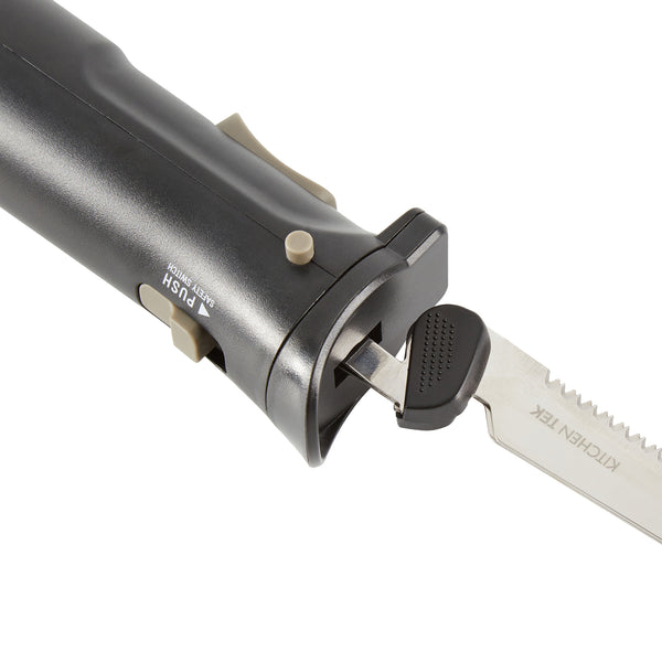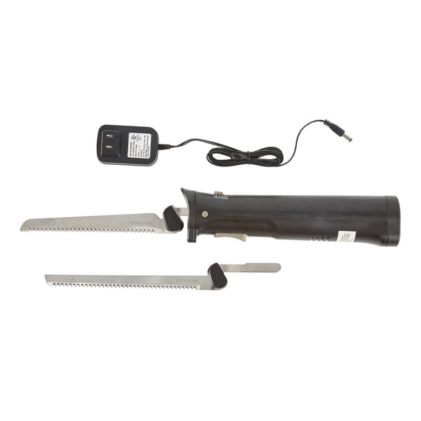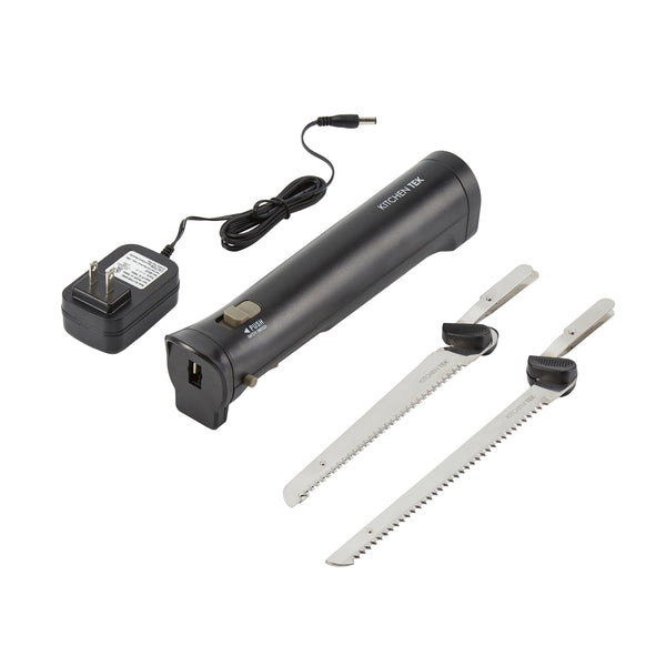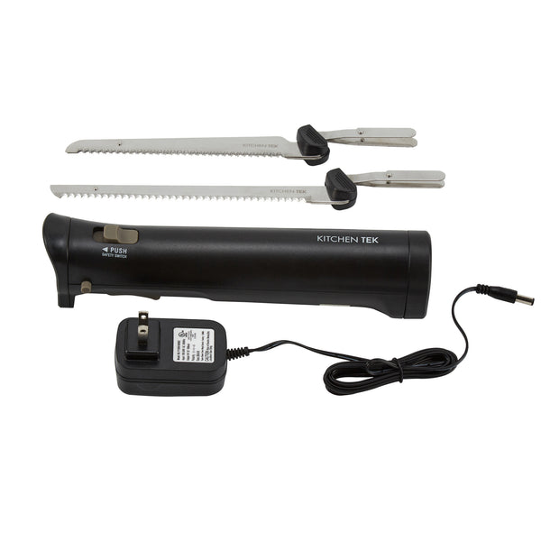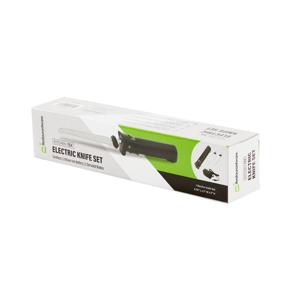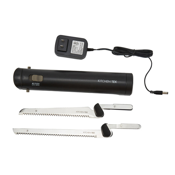 Enhance your culinary experience with our Kitchen Tek Cordless Electric Knife Set. This knife set includes one interchangeable carving blade and one bread blade, making it ideal for various kitchen needs. Powered by a lithium-ion battery, this cordless carving knife offer quick charging and an impressive 70-minute runtime. With an ergonomic handle, this electric knife set prevents fatigue during extended use, ensuring comfort and efficiency. The motorized handle of this cordless knife set features an on and off button for easy control. Plus, the safe lock switch of this bread knife ensures secure operation and prevents accidental activation. For added convenience, this electric sharp knife set features blade release buttons on both sides of the handle allow for quick and balanced blade swapping. With a detachable blade design, this electric carving knife is easy to clean in hot, soapy water, saving you valuable preparation time. Measuring 9.76 inches in length by 1.89 inches in width by 2.09 inches in height, this sharp knife set is compact yet powerful. Sold in a box with 1 handle, 1 carving knife, and 1 bread knife.