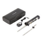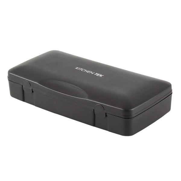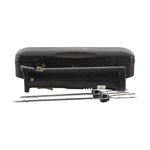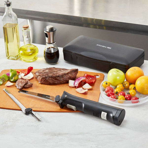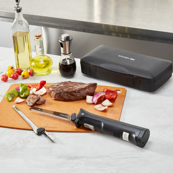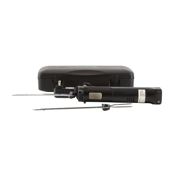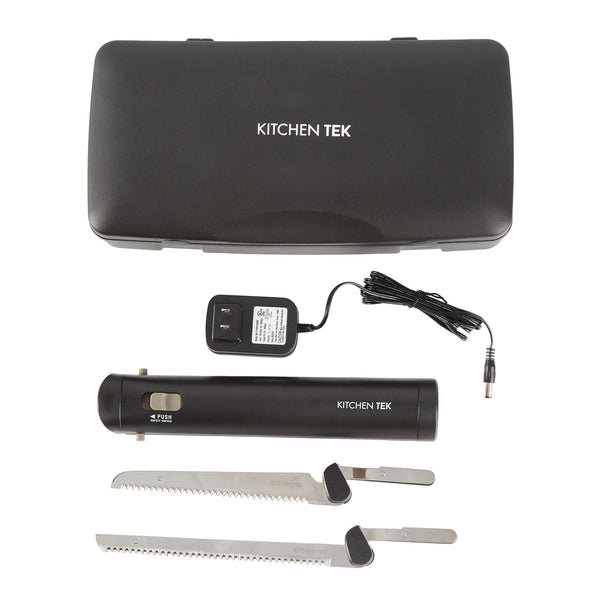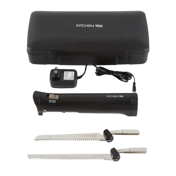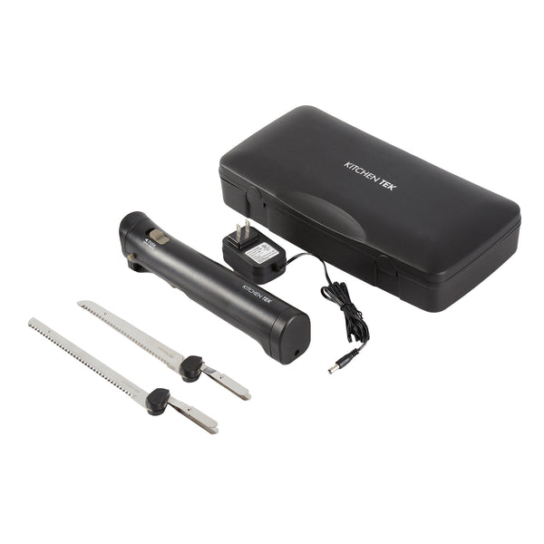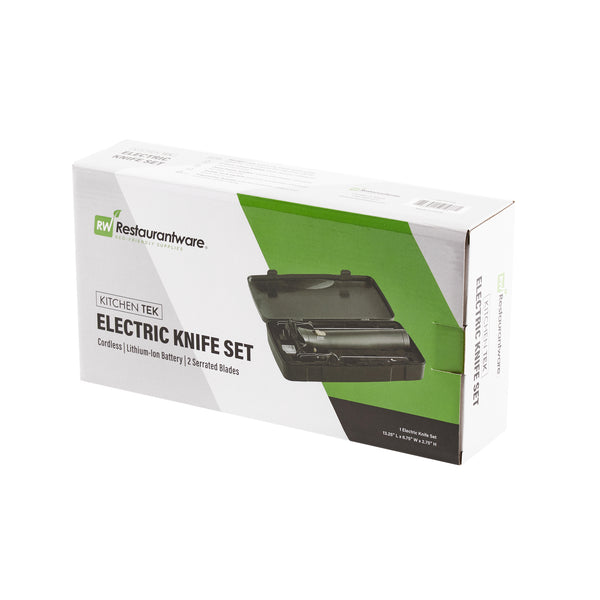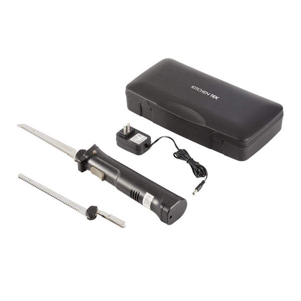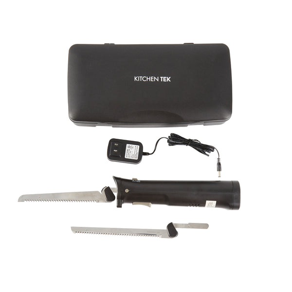 Enhance your kitchen efficiency with our Kitchen Tek Cordless Electric Knife Set. This electric knife set includes an interchangeable carving blade and a bread blade, making it ideal for a variety of cutting tasks. Equipped with a lithium-ion battery, this cordless carving knife allows for quick charging and offer 70 minutes of runtime. The motorized handle of this bread knife features an on and off button for easy control, ensuring smooth operation. With a safe lock switch on the handle, this durable knife set ensures secure use and prevents accidental activation. Ergonomically designed, the handle of this electric carving knife reduces fatigue during extended periods of use. With convenient blade release buttons on both sides of the handle, this bread knife set provide balanced access for quickly swapping out blades. The detachable blade design of this cordless electric knife set allows for easy cleaning in hot, soapy water, cutting down on preparation time. After use, pack the knife set away in its sturdy carrying case for convenient storage and transportation. Measuring 13.19 inches in length by 6.69 inches in width by 2.76 inches in height, this premium knife set is compact and easy to store. Sold in a box with 1 handle, 1 carving knife, 1 bread knife, and 1 storage case.