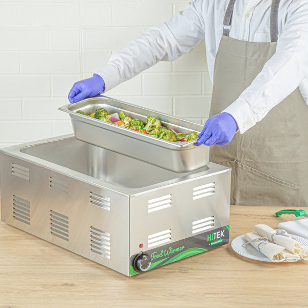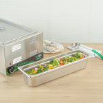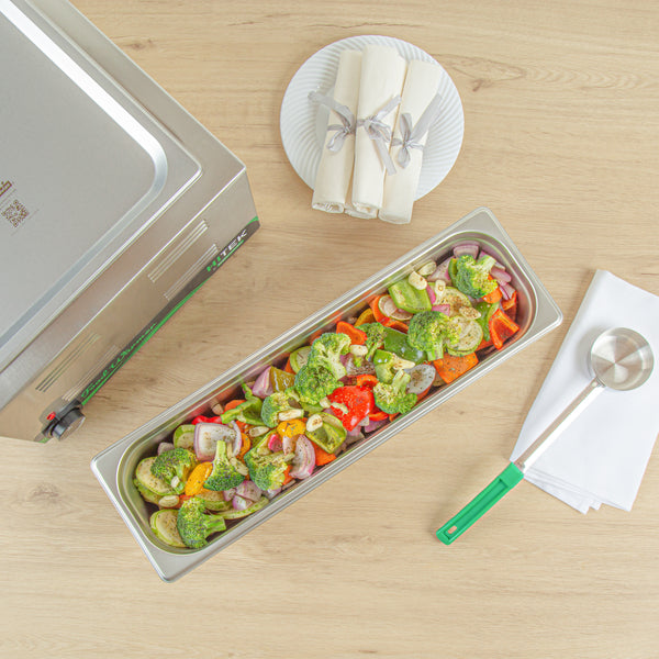 Keep your kitchen running at peak efficiency with our Kitchen Tek Stainless Steel 1/2 Size Long Steam Table Pans. These hotel pans incorporate anti-jam stacking lugs for non-stick separation and rapid accessibility, making them ideal in a high-traffic kitchen. Constructed from 24 gauge stainless steel, these steam pans are durable and withstand frequent use in any commercial foodservice setup. These stainless steel pans can be paired with their matching lids (SKUs: RWT1617S and RWT1625S) to ensure meals are safe from outside pollutants. Meeting the stringent NSF standards, these steam table pans meet the highest health and quality requirements for foodservice professionals. The 4-inch depth of these buffet pans allows for serving more voluminous options, such as thick stews and generous portions of side dishes. With their sturdy construction, these stainless steel catering pans are adept at serving both hot and cold foods. Engineered for oven use, these catering pans can withstand temperatures up to 1600F. These long table pans are freezer-safe, providing convenient storage for prepared meals. For simplified post-service cleanup, these stainless steel table pans are compatible with commercial dishwashers. These food pans measure 20.8 inches in length by 6.5 inches in width by 4 inches in depth. Sold in a 6 count box. Lids are available and sold separately.