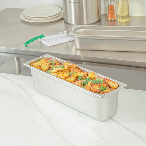 Provide an added layer of protection and freshness! These metal buffet pans can be paired with compatible lids to help keep your food secure and maintain optimal temperature during service.