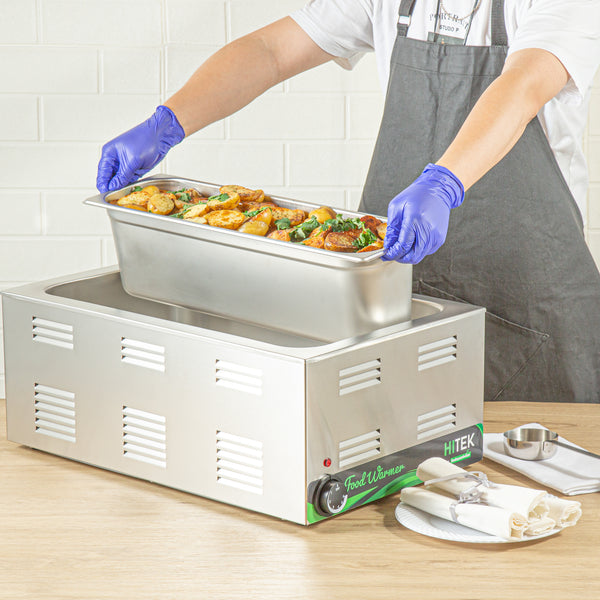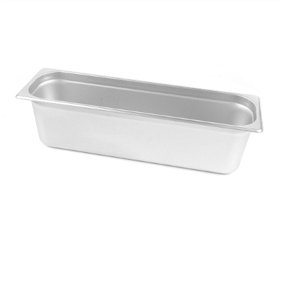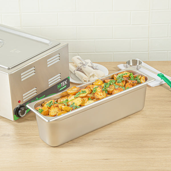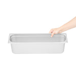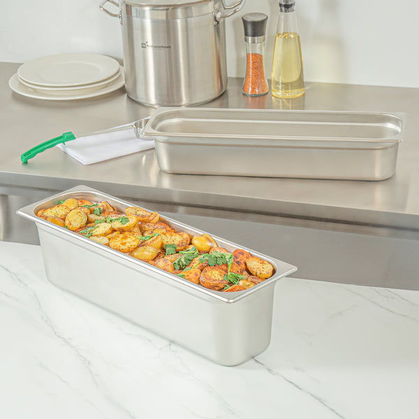 Optimize your catering or restaurant service with our Kitchen Tek Stainless Steel 1/2 Size Long Steam Table Pans. These steam table pans are equipped with anti-jam stacking lugs to facilitate easy de-stacking and immediate access, ideal for professional kitchens. Made from 24 gauge stainless steel, these hotel pans are durable and can withstand continuous use within any foodservice industry context. These buffet pans can be paired with their corresponding lids (SKUs: RWT1617S and RWT1625S) to ensure your culinary offerings are kept uncontaminated throughout service. Adhering to NSF standards, these steam pans meet the strict health and quality expectations in foodservice. The 6-inch depth of these stainless steel pans provides ample room for storing chopped vegetables and fruits. These stainless steel catering pans have a heavy-duty design and are adept at serving a variety of hot and cold dishes. Engineered for oven use, these catering pans can withstand temperatures up to 1600F. These long table pans are freezer-safe and facilitate convenient storage for prepared meals. For simplified post-service cleanup, these stainless steel table pans are compatible with commercial dishwashers. These food pans measure 20.8 inches in length by 6.5 inches in width by 4 inches in depth. Sold in a 6 count box. Lids are available and sold separately.