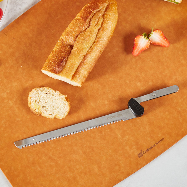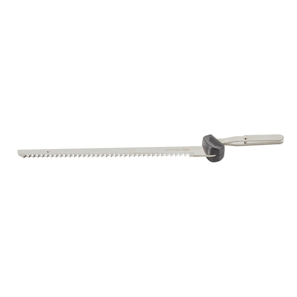 Elevate your bread-slicing experience with our Kitchen Tek Stainless Steel 11-inch Bread Blade. This bread knife is a direct replacement for the blade in the compatible cordless lithium electric knife set (SKU: RWT1967B), ensuring continued efficiency in your kitchen. Featuring a sturdy, serrated blade design, this bread cutter effortlessly slices through a variety of bread products, significantly cutting down on preparation time. Plus, this electric bread knife blade is detachable, allowing for quick and easy cleaning, which simplifies storage. This stainless steel blade knife is durable and withstands frequent use, ensuring longevity. Keep this bread blade on hand as an extra when immediate cleaning isn't an option but avoiding cross-contamination is crucial. Measuring 11.02 inches in length by 1.26 inches in width, this serrated bread knife is tailored for precision and ease of use. Sold in a 1 count box. Knife set is available and sold separately.