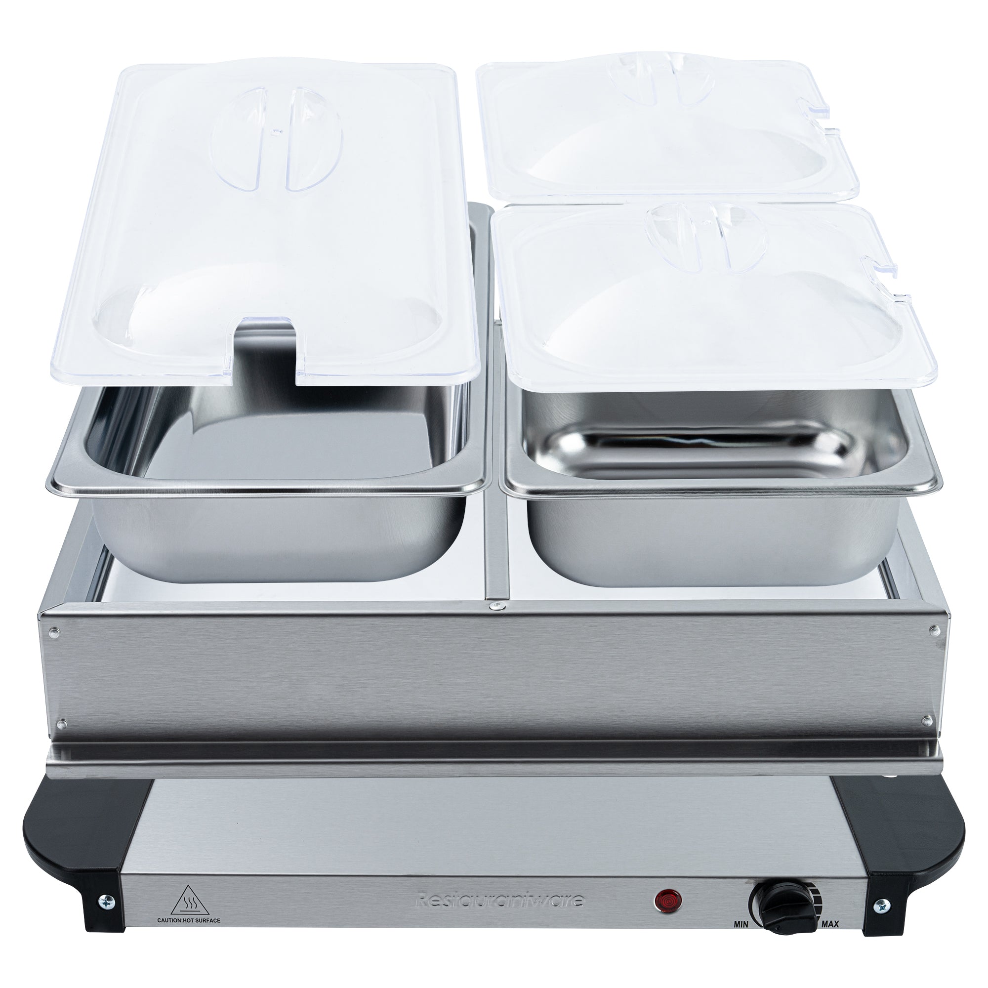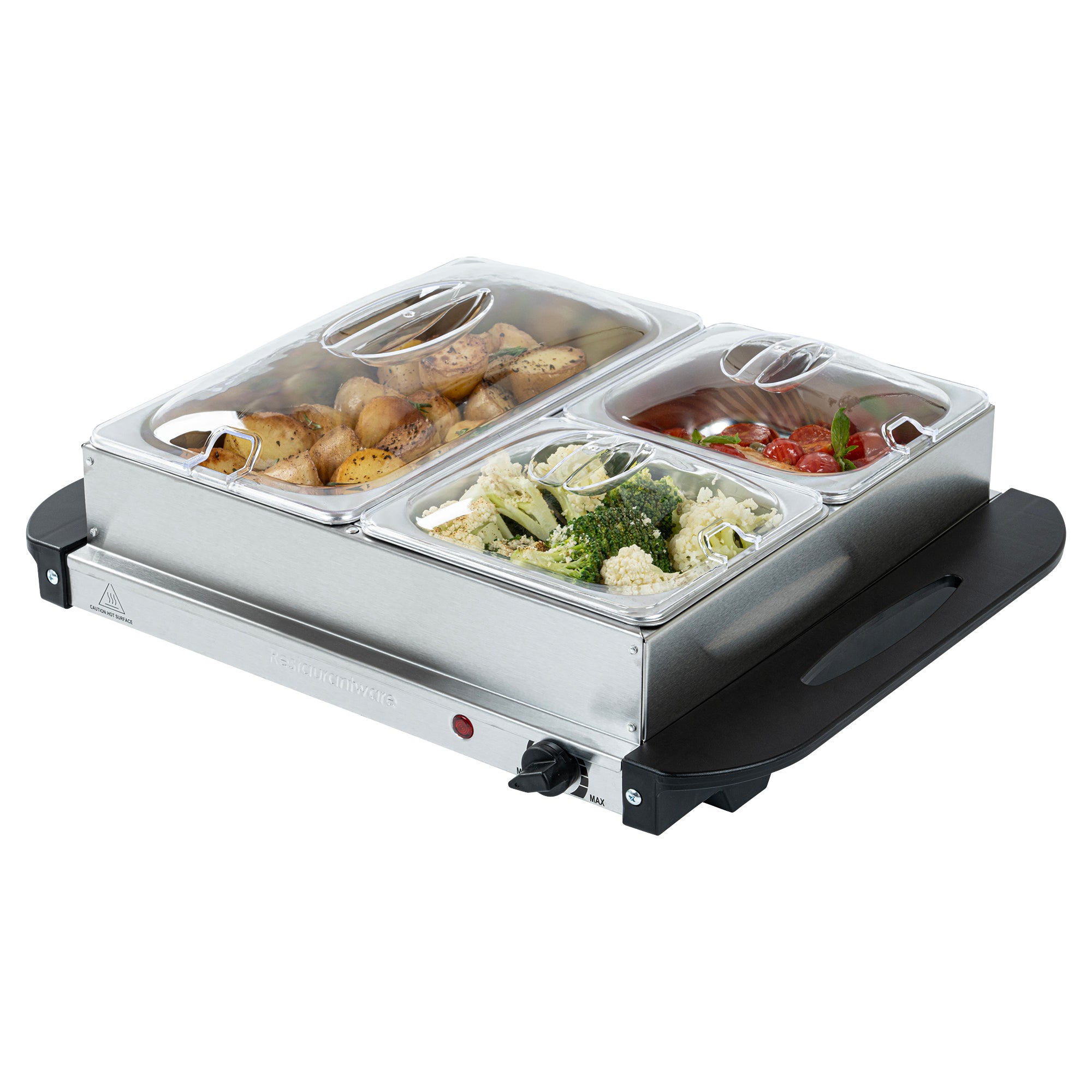 Optimize your foodservice experience with our Kitchen Tek Stainless Steel Buffet Server and Food Warmer. This electric food warmer operates on 120V, ensuring compatibility with standard outlets for convenient use. Featuring 2 buffet pans, each with a 1-quart capacity, and 1 additional larger pan holding up to 2.5 quarts, this commercial food warmer enables you to serve multiple dishes at once. With a precise temperature control knob, this portable food warmer allows for easy adjustments to maintain the desired warmth. To retain heat efficiently, this food warmer comes with a lid that ensures your food stays warm and ready to serve. The sturdy frame of this food warmer buffet holds the warming pans securely, preventing any movement during use. With attached side handles, this food warmer for catering is easy to carry and maneuver, ensuring safe and comfortable handling. The indicator light of this countertop food warmer provides a clear visual cue, showing when the unit is powered on and heating. Crafted from premium stainless steel, this buffet warmer ensures long-lasting durability, making it perfect for everyday use. This food warmer for parties measures 18.7 inches in length by 14.96 inches in width by 6.06 inches in height. Each order includes 1 warming unit and 3 buffet pans.