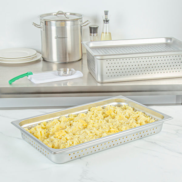 These steam table pans are crafted for versatility, with options in both solid and perforated designs to accommodate different cooking and serving needs. Choose the perfect style to streamline food preparation and presentation.