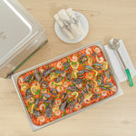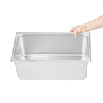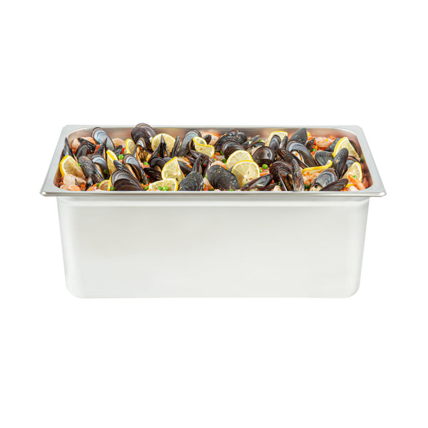 Experience ultimate functionality in your kitchen with our Kitchen Tek Stainless Steel Full Size Steam Table Pans. These steam table pans are designed with anti-jam stacking lugs, ensuring hassle-free separation and easy lifting. Crafted from 24 gauge stainless steel, these hotel pans are built to withstand the rigors of everyday use in busy commercial kitchens. To protect your food from dust, these buffet pans can be paired with compatible lids (SKUs: RWT1610S and RWT1618S). These steam pans meet NSF standards and ensure compliance with rigorous regulations for safety and sanitation in professional foodservice environments. Boasting an 8-inch depth, these stainless steel pans are ideal for holding lasagna, roasted vegetables, or baked chicken with ease. These metal pans are oven-safe and can withstand high temperatures up to 1600F. The freezer-safe design of these catering pans allows you to refrigerate your culinary creations conveniently. These full size pans are heavy-duty and ensure longevity, making them suitable for serving cold and hot food items. For a seamless cleaning experience, these metal catering pans can be used in a commercial dishwasher. These rectangle pans measure 20.8 inches in length by 12.8 inches in width by 8 inches in depth. Sold in a 6 count box. Lids are available and sold separately.
