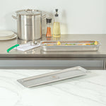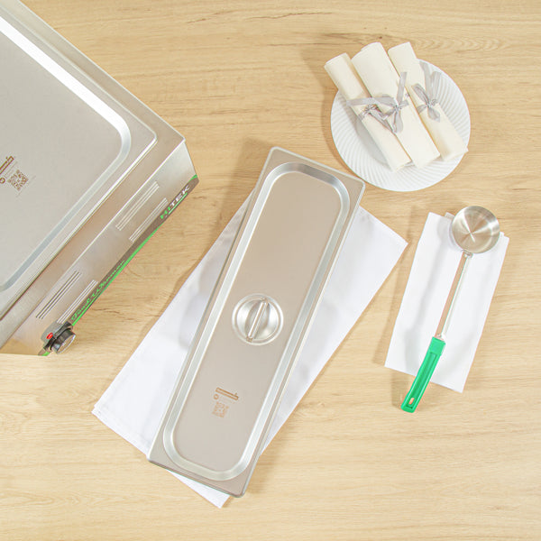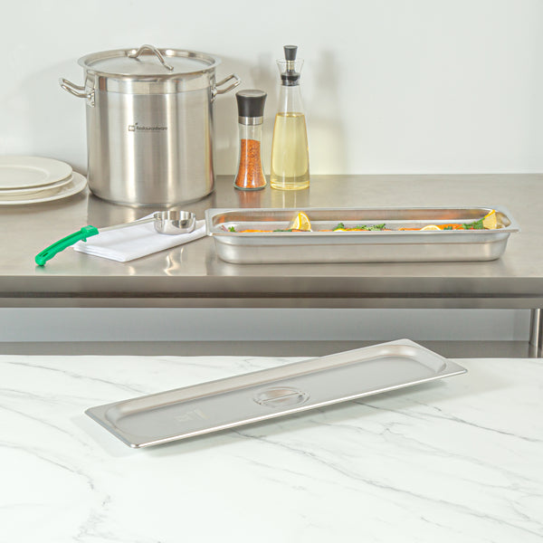 Enhance kitchen efficiency with heavy-duty design and style. The Kitchen Tek Stainless Steel Steam Table Pan Cover is crafted from robust 24 gauge stainless steel, ensuring it withstands frequent use at bustling foodservice establishments. This hotel pan lid is equipped with a flat handle that facilitates easy opening and closing, streamlining operations and improving kitchen efficiency. Featuring a polished exterior, this stainless steel pan lid with handle elevates the presentation of your culinary creations, adding sophistication to any dining experience. Measuring 20.8 inches in length and 6.4 inches in width, this silver lid fits seamlessly on long full size steam table pans, offering durability and a sleek look. Its dishwasher and freezer-safe properties make it a versatile and reliable addition to any professional kitchen. Ensure your kitchen is well-equipped with this essential tool. Each order includes 1 Kitchen Tek Stainless Steel Steam Table Pan Covers.