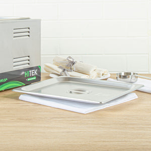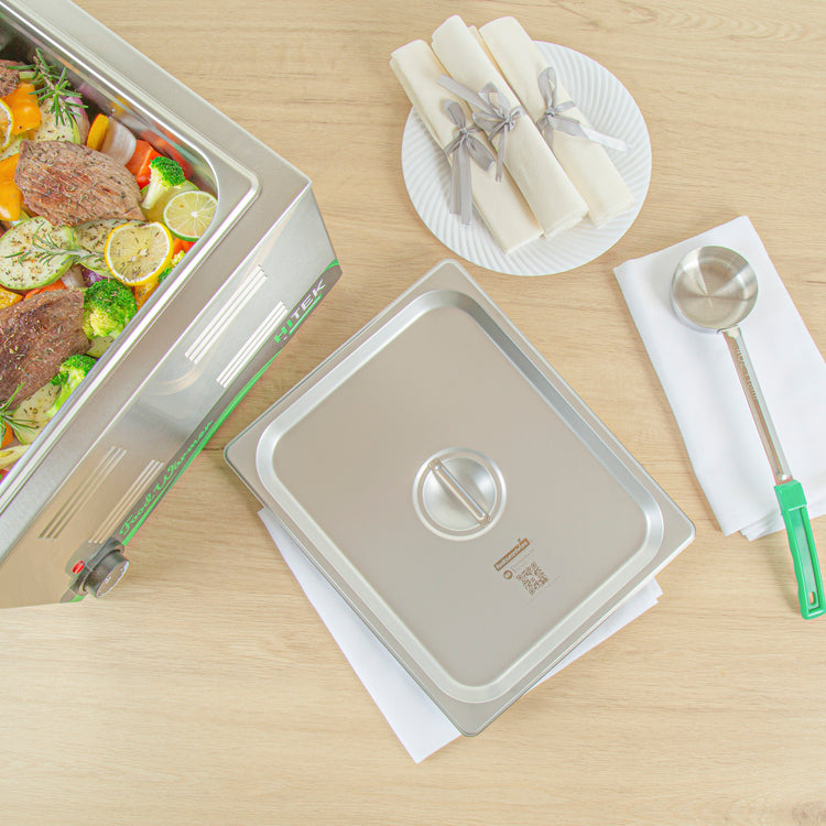 Enhance your kitchen efficiency with dependable cookware. The Kitchen Tek Heavy-Duty Hotel Pan Lid features heavy-duty 24 gauge stainless steel construction, ensuring it withstands frequent use in bustling foodservice environments. This stainless steel steam pan lid is designed with a flat handle that facilitates quick opening and closing, allowing for seamless transitions in fast-paced kitchens. Its polished silver exterior imparts an air of sophistication, elevating the presentation of your culinary creations and making it an ideal buffet pan lid for upscale catering events. Measuring 20.8 inches in length and 10.4 inches in width, this lid fits securely on compatible half size steam pans, ensuring optimal temperature retention. Its dishwasher-safe design simplifies cleanup, while freezer-safe properties offer versatile storage options. Invest in this reliable hotel pan lid to enhance your kitchen operations and elevate your dish presentations. Each order includes 1 Kitchen Tek Heavy-Duty Hotel Pan Lid.