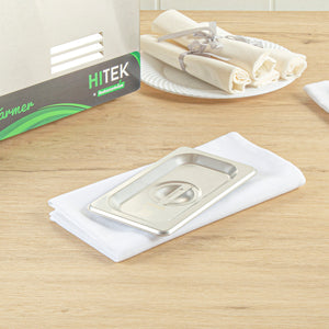 Enhance kitchen efficiency with a reliable steam table lid. The Kitchen Tek Heavy-Duty Stainless Steel Pan Cover is crafted from durable 24 gauge stainless steel, ensuring it withstands the frequent demands of busy foodservice establishments. This heavy-duty pan lid features a flat, ergonomic handle that facilitates easy and efficient operation, allowing chefs to seamlessly manage cooking tasks. Its polished exterior not only provides a sophisticated touch but also elevates the presentation standards of your culinary creations, making it an essential addition to any professional kitchen. Measuring 6.9 inches in length and 4.3 inches in width, this stainless steel pan cover is designed to fit snugly on standard 1/9 size pans, keeping your dishes warm and secure. Plus, its freezer-safe and dishwasher-safe construction adds unparalleled convenience to your food prep processes. Invest in this essential kitchen tool today to maintain the quality and appeal of your menu items. Each order includes 12 Kitchen Tek Heavy-Duty Stainless Steel Pan Cover.