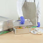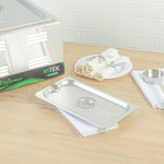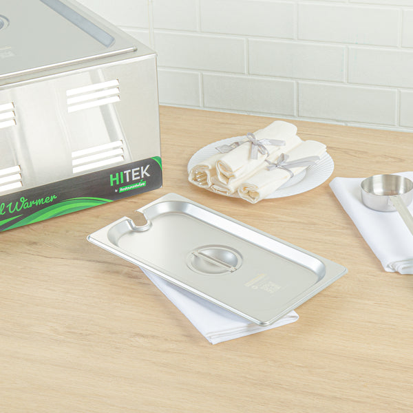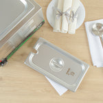 Enhance the functionality of your kitchen with our Kitchen Tek Stainless Steel Slotted Lids. Pair these metal lids with our collection of compatible Kitchen Tek 1/3 size steam table pans to elevate food preservation in your kitchen or buffet setup. Crafted from 24-gauge stainless steel, these lids for hotel pans ensure exceptional durability while effectively safeguarding your food. Featuring a flat, center handle, these lids ensure simple handling during use and provide ease of access in busy kitchen environments. The slotted design of these steam table lids allows convenient access for utensils without exposing the entire dish. Conforming to NSF standards, these pan lids meet commercial foodservice safety and health requirements. These chafer covers snugly fit and effectively trap heat, maintaining optimal food temperatures. Featuring a freezer-safe design, these steam pan lids offer versatility in food storage, providing convenient preservation solutions for your culinary needs. These catering pan lids are compatible with commercial dishwashers and facilitate easy and efficient cleanup. The polished exterior of these buffet pan lids adds sophistication, enhancing the presentation of your dishes. These stainless steel lids measure 12.8 inches in length by 6.9 inches in width. Sold in a 12 count box. Steam table pans are available and sold separately.