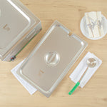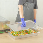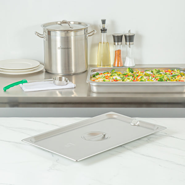 Optimize your kitchen efficiency with our Kitchen Tek Stainless Steel Slotted Lids. Pair these metal lids with our collection of compatible Kitchen Tek full size steam table pans to prevent unwanted contaminants from entering the food. Crafted from heavy-duty 24 gauge stainless steel, these lids for hotel pans offer durability and reliability, providing optimal protection for your culinary creations. The precision-crafted flat, center handle on these lids ensures effortless opening and closing, providing convenient access while maintaining the premium look of your service. Featuring an open slot at the side, these steam table lids facilitate quick access to kitchen tools such as ladles. Featuring a freezer-safe design, these steam pan lids offer flexibility in food storage, providing convenient preservation solutions for your culinary needs. These pan lids meet NSF standards, standing up to the demands of the foodservice industry without compromise. Compatible with commercial dishwashers, these catering pan lids facilitate easy and efficient cleanup. The polished exterior of these buffet pan lids adds a touch of sophistication, enhancing the presentation of your dishes. Measuring 20.8 inches in length by 12.8 inches in width, these stainless steel lids provide a professional look for your setup. Sold in a 12 count box. Steam table pans are available and sold separately.