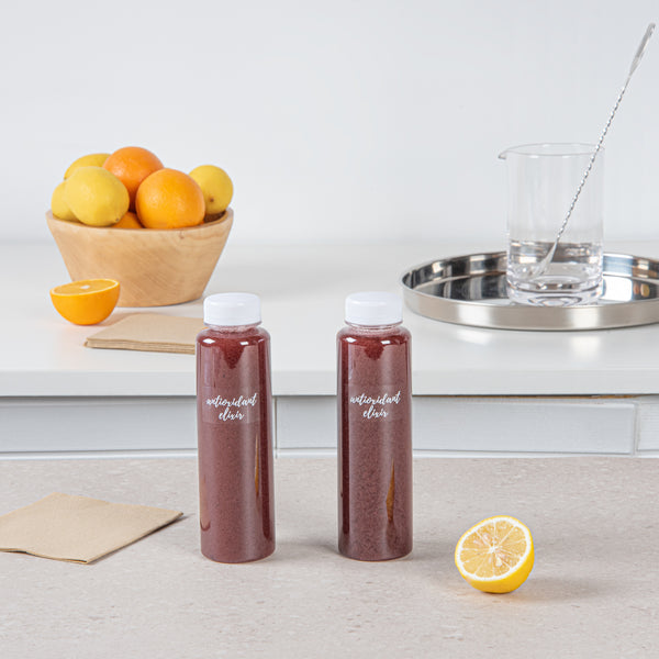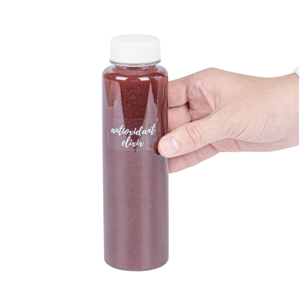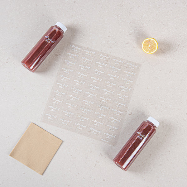 Keep juices neatly organized using our Label Tek Plastic Antioxidant Elixir Labels. These water-resistant juice labels are built to hold up to condensation, making them excellent for labeling chilled beverages or juice shots. Reading "ANTIOXIDANT ELIXIR" in white cursive font, these drink labels provide your health-conscious customers with an effortless way to identify juices filled with antioxidants to minimize contact with other bottled drinks. Featuring a clear background, these elixir labels create a seamless look on juice bottles while allowing customers to view the lively colors of cold-pressed juices. Plus, they create a charming and trendy look that eliminates the need for personalized stickers. Pair these clear juice labels with our selection of tamper-evident juice bottles and drink pouches to easily package to-go juices that charge up your guests' immune system. These antioxidant elixir labels come in a sheet, allowing employees to quickly label bottled juices at your juice bar, restaurant, or catered event. Each water-resistant label measures 2 inches long by 1 inch wide. Sold in a 100 count box. Drink pouches and juice bottles sold separately. Browse our selection of water-resistant juice labels to find the perfect packaging solution for each beverage to increase order accuracy.