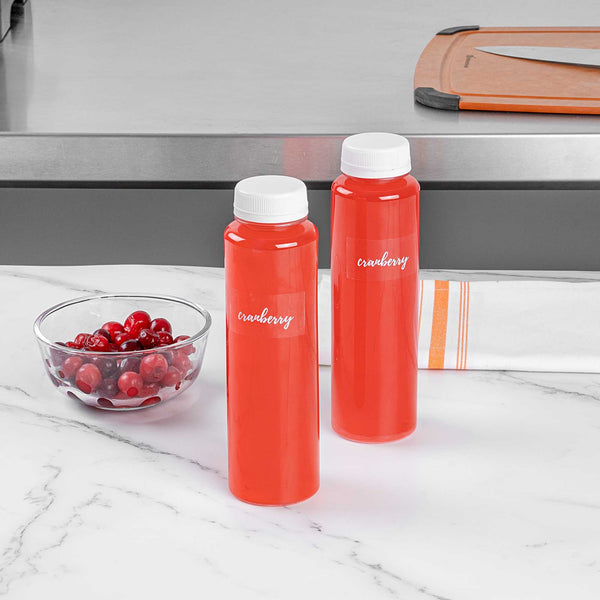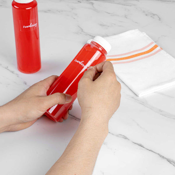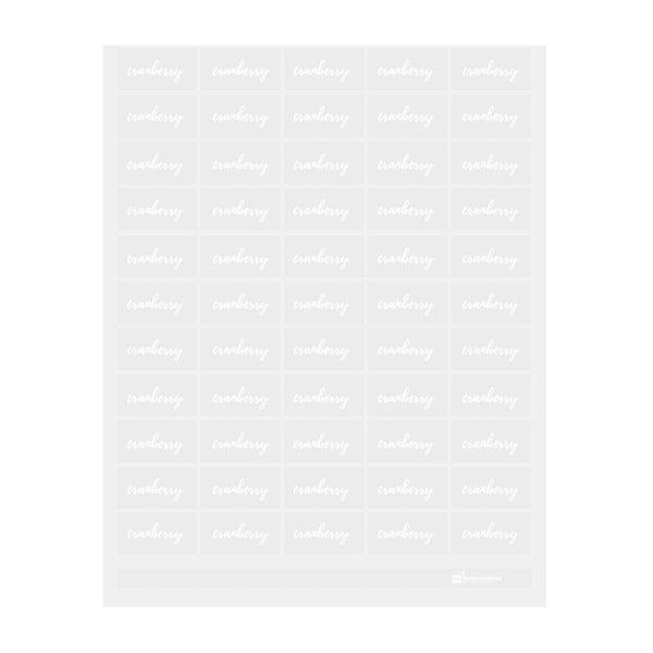 Bring style to bottled beverages using our Label Tek Plastic Cranberry Labels. These clear sticker labels feature a water-resistant construction that holds up against condensation to eliminate labels from falling off while keeping drinks cold. Ideal for making beverages look chic and easy to identify for customers, these pantry labels are designed with a clear background and a white cursive font that reads "cranberry". The strong, sticky adhesive on the back of these kitchen labels are perfect for sealing stickers onto any kind of bottle or container. Coordinate these beverage labels with our collection of tamper-evident juice bottles and drink pouches to securely package cranberry juices for take out or delivery services. To save storage space and speed up your employee's packaging process, these clear sticker labels arrive in a sheet. These pantry labels measure 2 inches in length and 1 inch in width. Sold in a 100 count box. Browse our selection of water-resistant labels to find the perfect packaging solution for your take out orders.