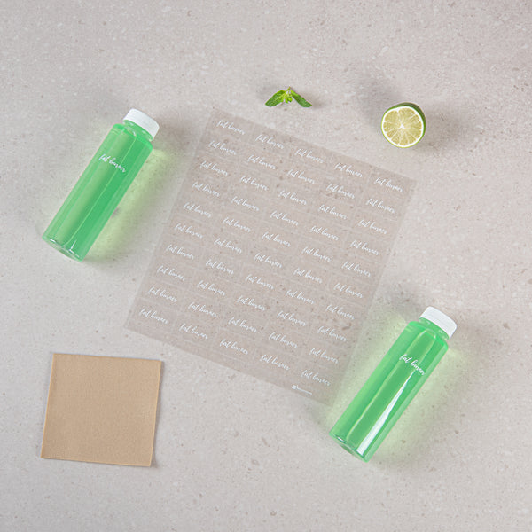 Use our Label Tek Plastic Fat Burner Labels to organize bottled juices stored in commercial refrigerators or grab-and-go cases. These juice bottle labels read "FAT BURNER" in a white cursive font, allowing customers to quickly locate fat burner juices without having to sort through other prepackaged beverages. Featuring a clear background, these fat burner labels create a seamless look on juice bottles and allow guests to appreciate the lively colors of grab-and-go juices. These juice stickers are water-resistant, ensuring that labels stay legible and don't peel off due to condensation. To prevent messy accidents when transporting cold-pressed juices, pair these clear drink labels with our tamper-evident juice bottles and drink pouches. These fat burner stickers are ideal for labeling fruit juices, vegetable drinks, juice shots, and other beverages designed to help your customers lose weight and burn fat. Measuring 2 inches long by 1 inch wide, these fat burner labels come in a sheet to streamline the labeling process at your juice bar, restaurant, or cafeteria. Sold in a 100 count box. Juice bottles and drink pouches are available and sold separately. Browse our collection of juice labels to find the perfect packaging solution for to-go beverages.