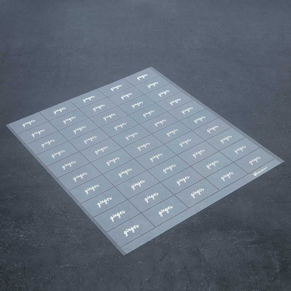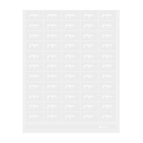 PLASTIC GINGER LABEL - CLEAR WITH WHITE FONT, WATER-RESISTANT