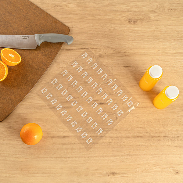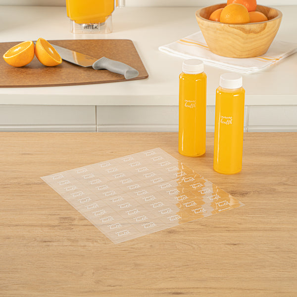 Make it easy for employees to distinguish immune-boosting juices from other beverages using our Label Tek Plastic Immune Health Labels. With a water-resistant design, these juice drink labels can hold up to condensation from chilled juices to stay legible and prevent them from peeling off. These fruit juice labels have a clear background with white font to create a seamless look on juice bottles and eliminate the need for personalized juice labels. Reading "IMMUNE HEALTH" in cursive, these water-resistant labels allow guests to easily find juices specially made to boost their immune system without sorting through bottled juices in drink displays. To avoid messy spills when transporting juices, pair these water-resistant labels with our tamper-evident juice bottles and drink pouches. These juice bottle labels are perfect for labeling juice shots, cold-pressed juices, or other drinks intended to provide customers with essential nutrients. Measuring 2 inches long by 1 inch wide, these immune-booster labels come in a sheet to provide your staff with a quick way to label multiple juice bottles and increase order accuracy. Shipped in a 100 count box. Juice bottles and drink pouches are available and sold separately. Browse our collection of juice labels to organize your drink bottles for easy identification.