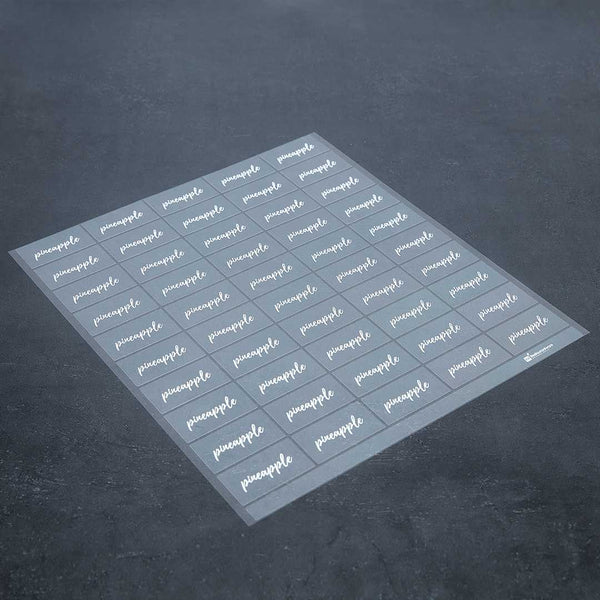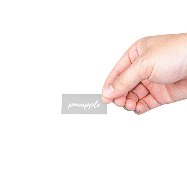 Make smoothies, juices, and shakes easy for customers to find using our Label Tek Plastic Pineapple Labels. Great for grocery stores, bars, or restaurants, these stickers for juice bottles have a water-resistant construction that is made to hold up against condensation from chilled beverages to keep stickers in place. These pineapple labels feature a clear background and a white cursive font that reads "pineapple" so guests can quickly identify their desired beverages while minimizing direct contact with other bottles or containers. These kitchen label stickers are designed with a strong adhesive that expertly seals onto all kinds of surfaces. Coordinate these beverage labels with our collection of tamper-evident juice bottles and drink pouches to securely package pineapple juices for take out or delivery services. To make the most out of your kitchen's storage space, these stickers for juice bottles arrive in a sheet. These pineapple labels measure 2 inches in length and 1 inch in width. Sold in a 100 count box. Browse our selection of water-resistant labels to find the perfect packaging solution for your take out orders.