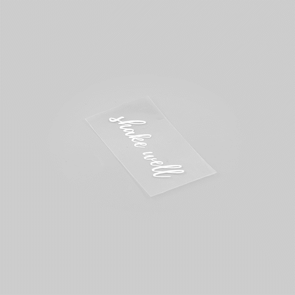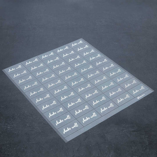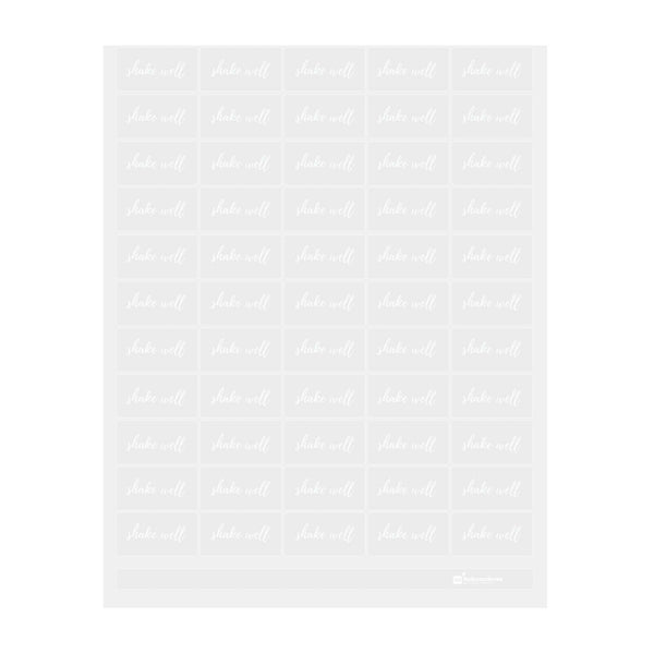 PLASTIC SHAKE WELL LABEL - CLEAR WITH WHITE FONT, WATER-RESISTANT