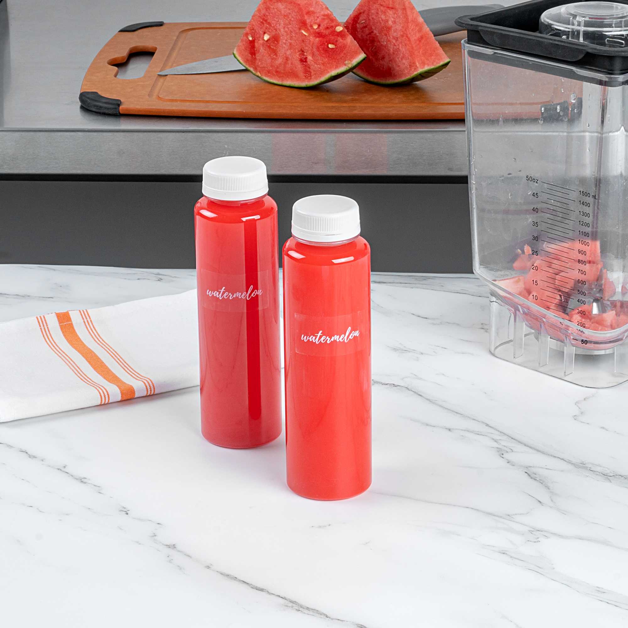 Label bottled watermelon juices for take out or delivery services using our Label Tek Plastic Watermelon Labels. Made from premium plastic, these juice bottle labels are water-resistant to ensure they hold up to condensation and don't smudge when labeled juice bottles are stored in commercial fridges. These beverage bottle labels read "watermelon" in cursive, providing your staff with a simple way to organize bottled watermelon juices in drink displays and increase order accuracy at your cafeteria, restaurant, or juice shop. Featuring a clear background with white font, these fruit juice labels create a cohesive and stylish look that elevates the aesthetics of your grab-and-go watermelon juices. Securely seal to-go watermelon juices by coordinating these juice stickers with our selection of tamper-evident juice bottles and drink pouches. These watermelon labels arrive in a sheet, providing your employees with an easy and effortless way to label a number of bottled juices throughout their shifts. Each label for juice bottles measures 2 inches long by 1 inch wide. Shipped in a 100 count box. Drink pouches and juice bottles are available and sold separately. Browse our selection of water-resistant beverage labels to find the perfect packaging solution for your drink offerings.