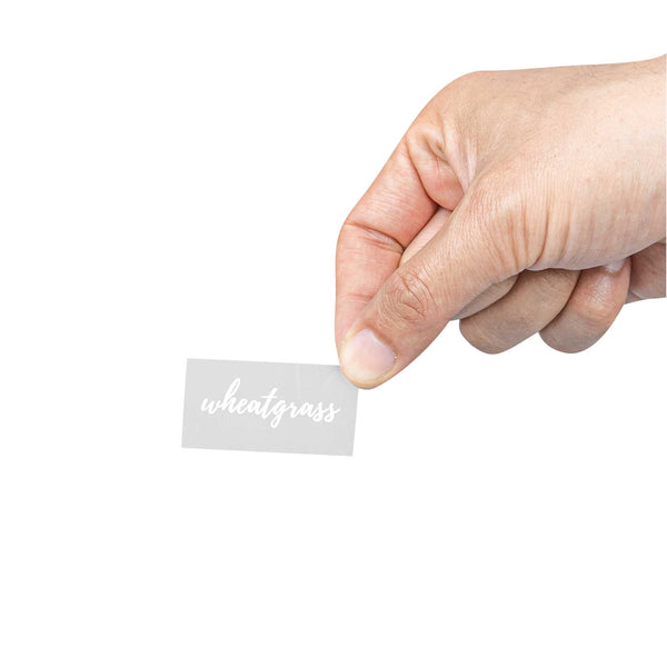 Use our Label Tek Plastic Wheatgrass Labels to keep wheatgrass juices neatly organized. With a water-resistant design, these stickers for drinks allow you to store labeled wheatgrass juices in refrigerated cases without worrying about condensation smudging stickers. Each drink sticker reads "wheatgrass" in a trendy font to add a charming look and enhance the visual aspect of your healthy juices. Plus, they allow customers to quickly identify bottled juice shots that are intended to provide them with essential nutrients. These drink stickers feature a clear background with white font to create a seamless look on juice bottles. To prevent accidental spills when serving wheatgrass juices, pair these juice stickers with our collection of coordinating juice bottles and drink pouches. Measuring 2 inches long by 1 inch wide, these wheatgrass labels arrive in a sheet to streamline the labeling process at your restaurant or grab-and-go operation. Shipped in a 100 count box. Juice bottles and drink pouches are available and sold separately. Browse our selection of juice labels to create a cohesive look and eliminate the need for personalized labels.