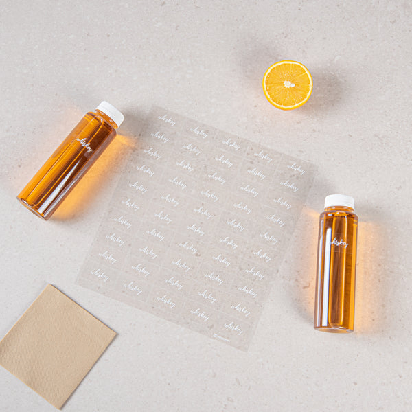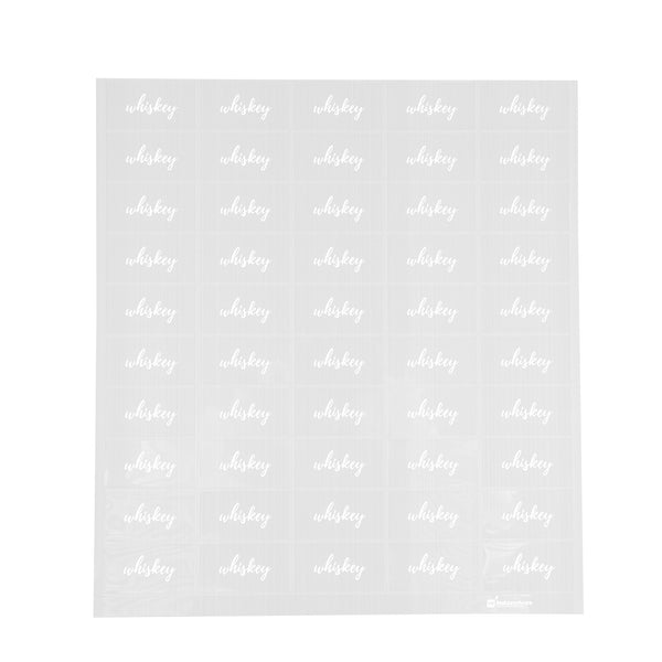 Easily identify and label cocktails using our Label Tek Plastic Whiskey Labels. Perfect for labeling chilled beverages, these whiskey labels have a water-resistant construction that expertly holds up against congestion and stops labels from falling or peeling off. These whiskey stickers feature a white cursive font that reads "Whiskey" so guests can easily identify their preferred beverages while minimizing direct contact with other bottles or drink kits. Great for creating a seamless look, these alcohol labels are designed with a clear background. These whiskey labels include a strong adhesive that securely sticks onto liquor bottles or containers. Perfect for order accuracy and streamlining the labeling process, these whiskey stickers arrive in a sheet. These alcohol labels measure 2 inches in length by 1 inch in width. Shipped in a 100 count box. Browse our selection of water-resistant labels to find the perfect packaging solution for your take out orders.