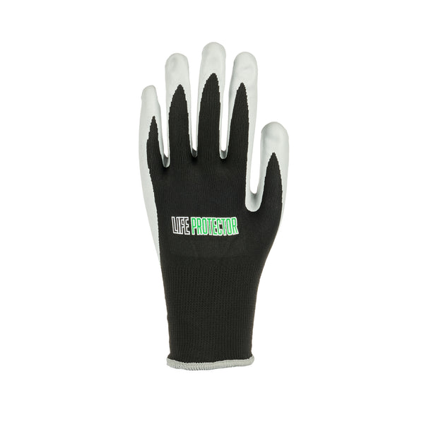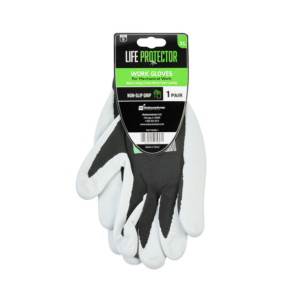 Shield your hands during tough tasks with our Life Protector Black Nylon Extra Large Work Gloves. These heavy-duty gloves feature a nitrile coating that prevents oil and grease from contacting your skin, ensuring optimal safety. Designed with foam technology, these breathable gloves keep your hands cool and prevent sweating, making them perfect for long work hours. With a nylon lining, these protective gloves provide a comfortable and snug fit during extensive wear. The 13-gauge thickness of these work gloves offers an additional layer of protection, ideal for tough working conditions. Suitable for engine repairs, equipment maintenance, and workshop projects, these black hand gloves are designed for mechanical work.These mechanic gloves are hand washable for easy upkeep, ensuring long-lasting performance. Showcasing a sleek black finish, these nitrile-coated gloves conceal dirt and wear, making them perfect for warehouse settings. Measuring 10.25 inches in length by 4.5 inches in width, these black gloves fit comfortably while providing ample coverage. Each order includes 1 pair of extra large work gloves.