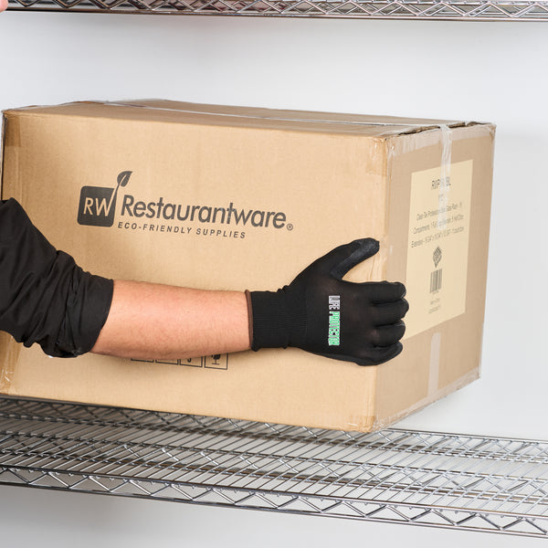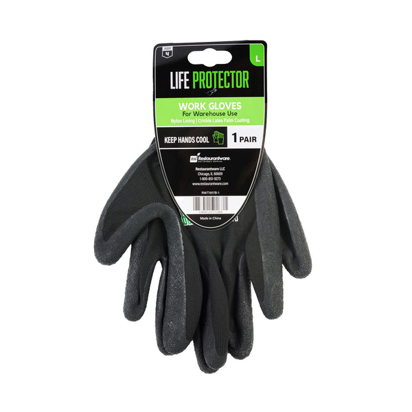 Protect your hands with our Life Protector Black Nylon Large Work Gloves. Featuring a latex coating, these heavy-duty gloves resist punctures and avoid absorbing moisture, ensuring safety from sharp objects or potential injuries. The crinkle pattern on these black gloves significantly improves the grip, especially on slippery or wet surfaces, reducing the likelihood of slipping. Plus, the nylon lining of these protective gloves keeps hands cool and offers a comfortable fit, reducing friction against the skin. Designed with 13-gauge thickness, these warehouse gloves provide an added layer of protection in tough working conditions. Perfect for warehouse work, these black work gloves are suitable for handling heavy materials and equipment. These large nylon gloves are hand washable for easy upkeep and maintenance. The sleek black finish of these work gloves helps conceal dirt and wear, making them ideal for demanding warehouse environments. Measuring 9.75 inches in length by 4.25 inches in width, these durable gloves provide ample coverage and protection. Each order includes 10 pairs of large work gloves.