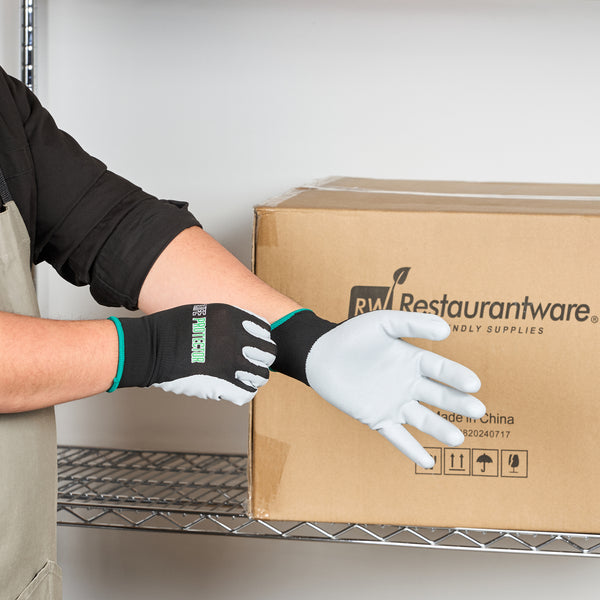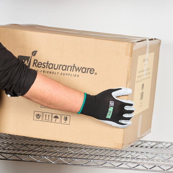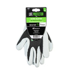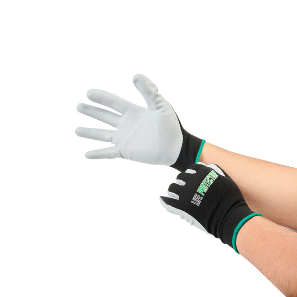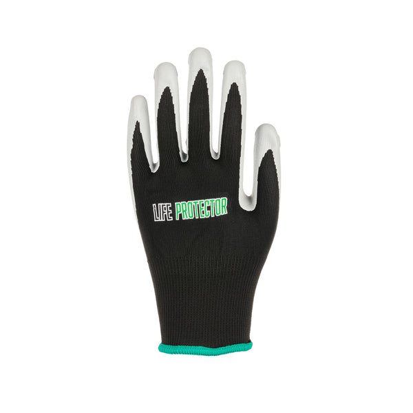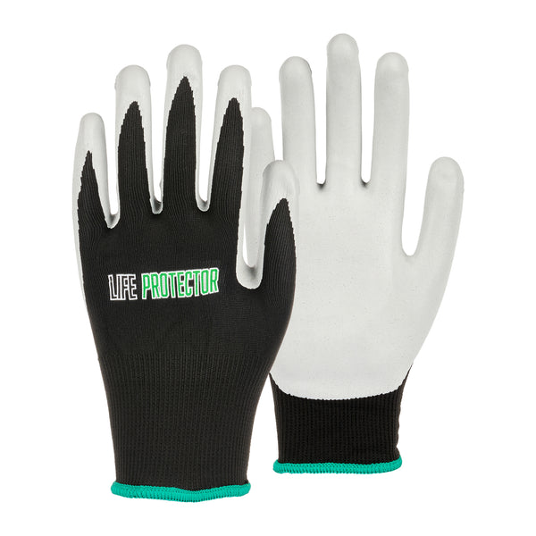 Enhance your work efficiency with our Life Protector Black Nylon Medium Work Gloves. These heavy-duty gloves feature a nitrile coating that effectively keeps oil and grease from coming into contact with your skin. With advanced foam technology, these protective gloves are breathable, ensuring your hands stay cool to prevent sweating. The nylon lining of these mechanic gloves provides maximum comfort during extended wear. These black gloves boast a 13-gauge thickness for added protection in tough working conditions. Designed specifically for mechanical tasks, these hand gloves are perfect for engine repairs, equipment maintenance, and workshop projects. These black work gloves are hand washable for easy upkeep and maintenance. The sleek black finish creates a neat look and helps conceal dirt and wear, making them ideal for demanding warehouse environments. Measuring 9.5 inches in length by 4.25 inches in width, these work gloves provide a perfect fit for medium-sized hands. Each order includes 1 pair of medium work gloves.