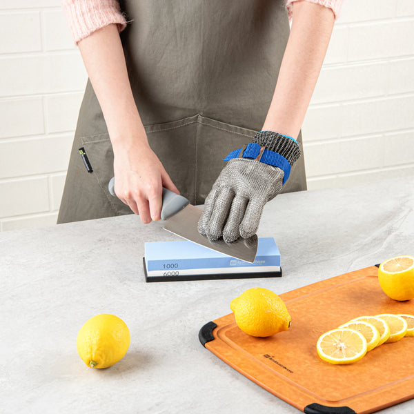 These mesh cutting gloves come with adjustable wrist straps in red, blue, white and orange shades, allowing you to pick your favorite color. Classy way to cook!