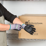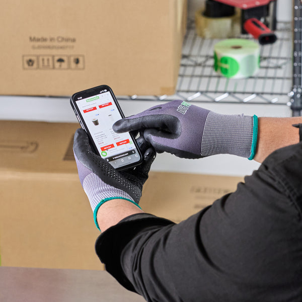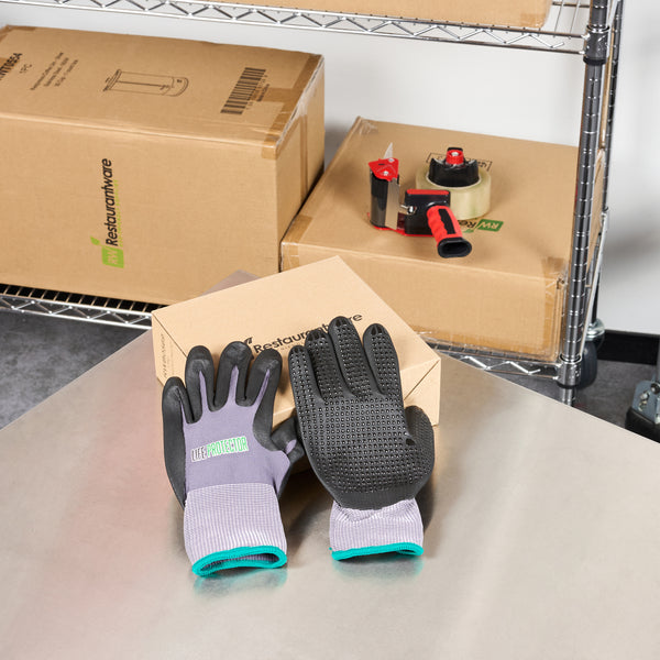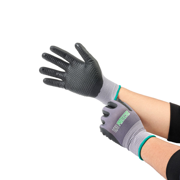 Equip your team with our Life Protector Gray Nylon / Spandex Medium Work Gloves. These work gloves feature a dotted palm that provides an enhanced grip, making it easier to handle tools and objects securely on slippery surfaces like oil or water. For precise handling and dexterity, the ultra-thin foam nitrile coating on these heavy-duty gloves is perfect for managing small or delicate objects. Designed with foam technology, these protective gloves are breathable to keep hands cool and prevent sweating. With a snug and comfortable fit, the lining made from a blend of nylon and spandex of these gray gloves improves dexterity for intricate tasks. Engineered with 15-gauge thickness, these mechanic gloves provide an added layer of protection in tough working conditions. Ideal for automotive work, these premium work gloves are suitable for mechanical repairs, workshop tasks, and heavy-duty jobs. These gray work gloves are hand washable for simple upkeep and maintenance. For a sleek, professional look, the gray finish of these hand gloves hides dirt and stains efficiently. These gray hand gloves measure 9.5 inches in length by 4.25 inches in width. Each order includes 1 pair of medium work gloves.